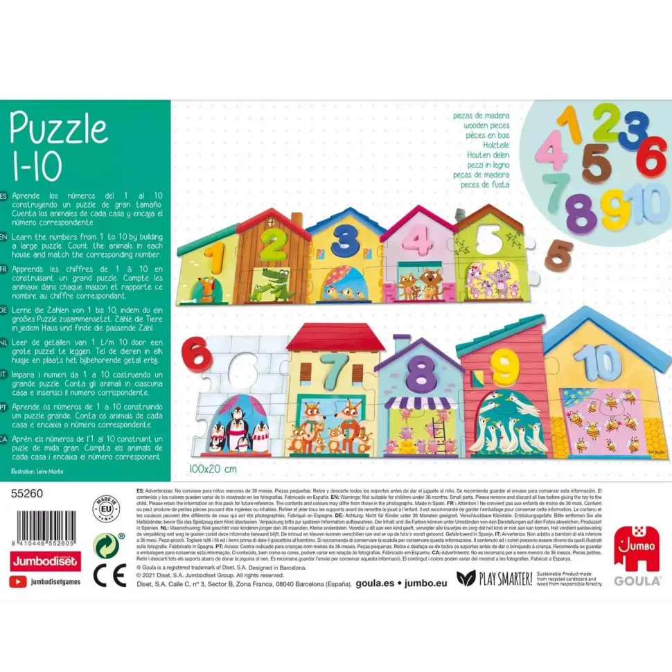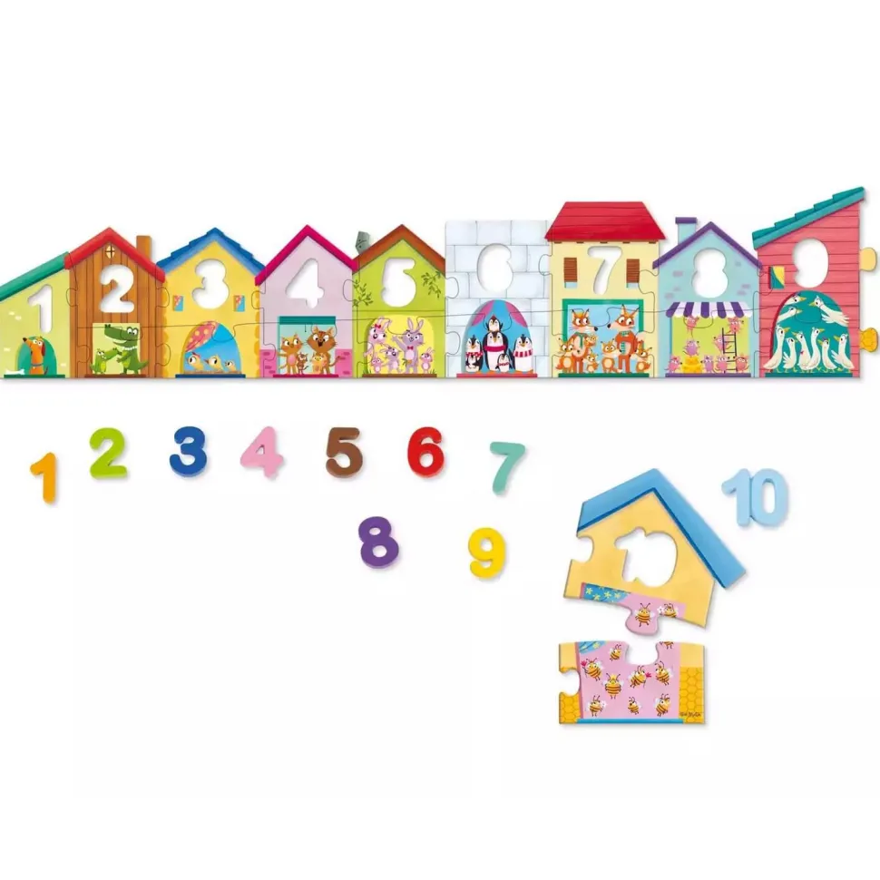 Le jeu Puzzle 1-10 permettra le développement mathématique de votre enfant. Ce jeu lui permettra d’apprendre à compter tout en s’amusant ! Apprends les chiffres de 1 à 10 en construisant un grand puzzle. Compte les animaux dans chaque maison et rapporte ce nombre au chiffre correspondant. Ce produit est le compromis parfait entre l’apprentissage et l’amusement, en effet votre petit apprendra mais ne verra pas le temps passé grâce à l’aspect ludique du jeu !