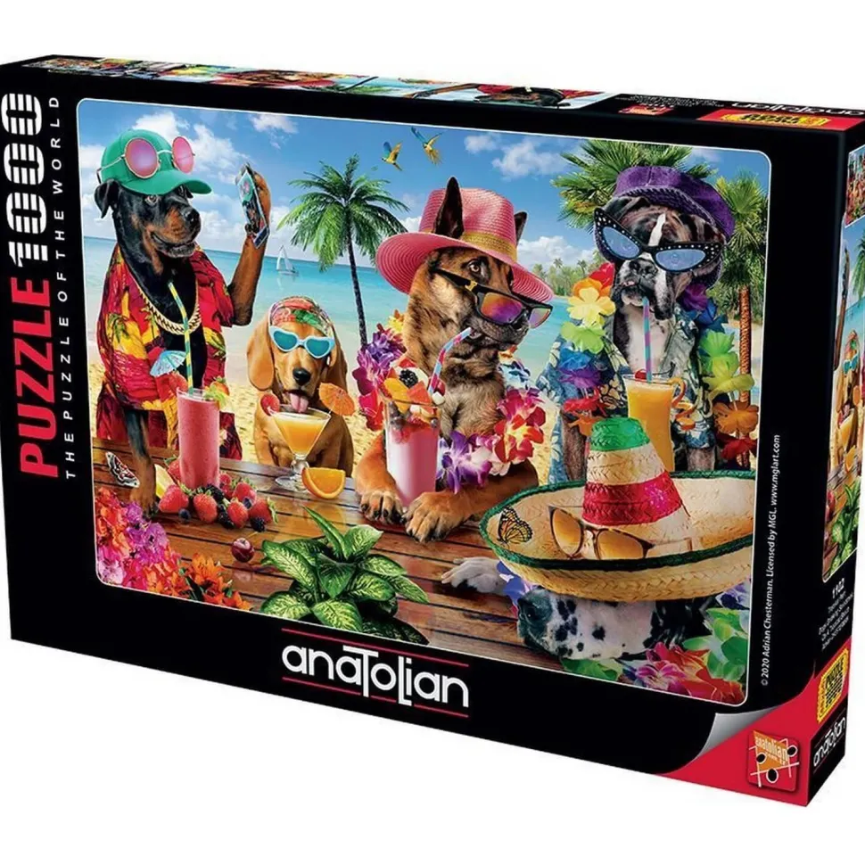 Description du produit : Puzzle 1000 pièces : Chiens buvant des smoothies sur une plage tropicale