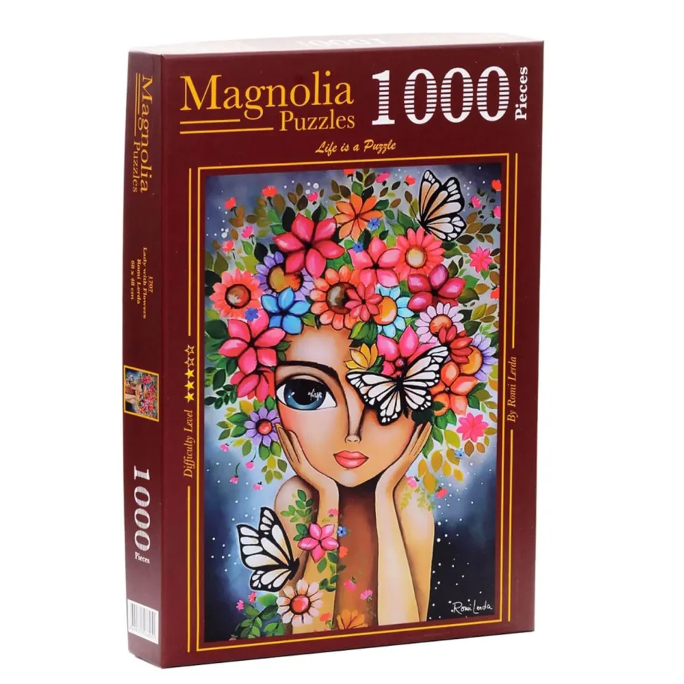 Description du produit : Puzzle 1000 pièces : Dame aux Fleurs – Romi Lerda – Edition Spéciale