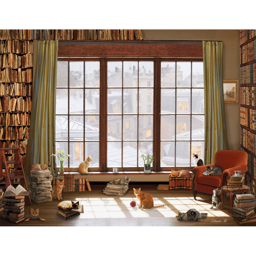 L’artiste David Maclean représente dans son oeuvre une jolie bibliothèque, lieu de vie de nombreux chats. Ces petits chats aux pelages tous différents semblent confortablement installés dans cette pièce. On peut en apercevoir certains regarder à la fenêtre, d’autres se reposer utilisant les piles de livres en guise de matelas alors que d’autres encore s’amusent avec un pompon. Ce puzzle sur le thème des chats est de la marque Anatolian. Il est conçu en carton et mesure une fois assemblé 66 cm de longueur pour 48 cm de largeur. Il s’agit d’un puzzle de difficulté moyenne comportant 1000 pièces qui est adapté pour les plus de 12 ans.