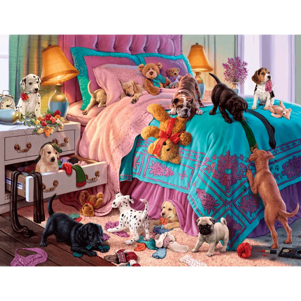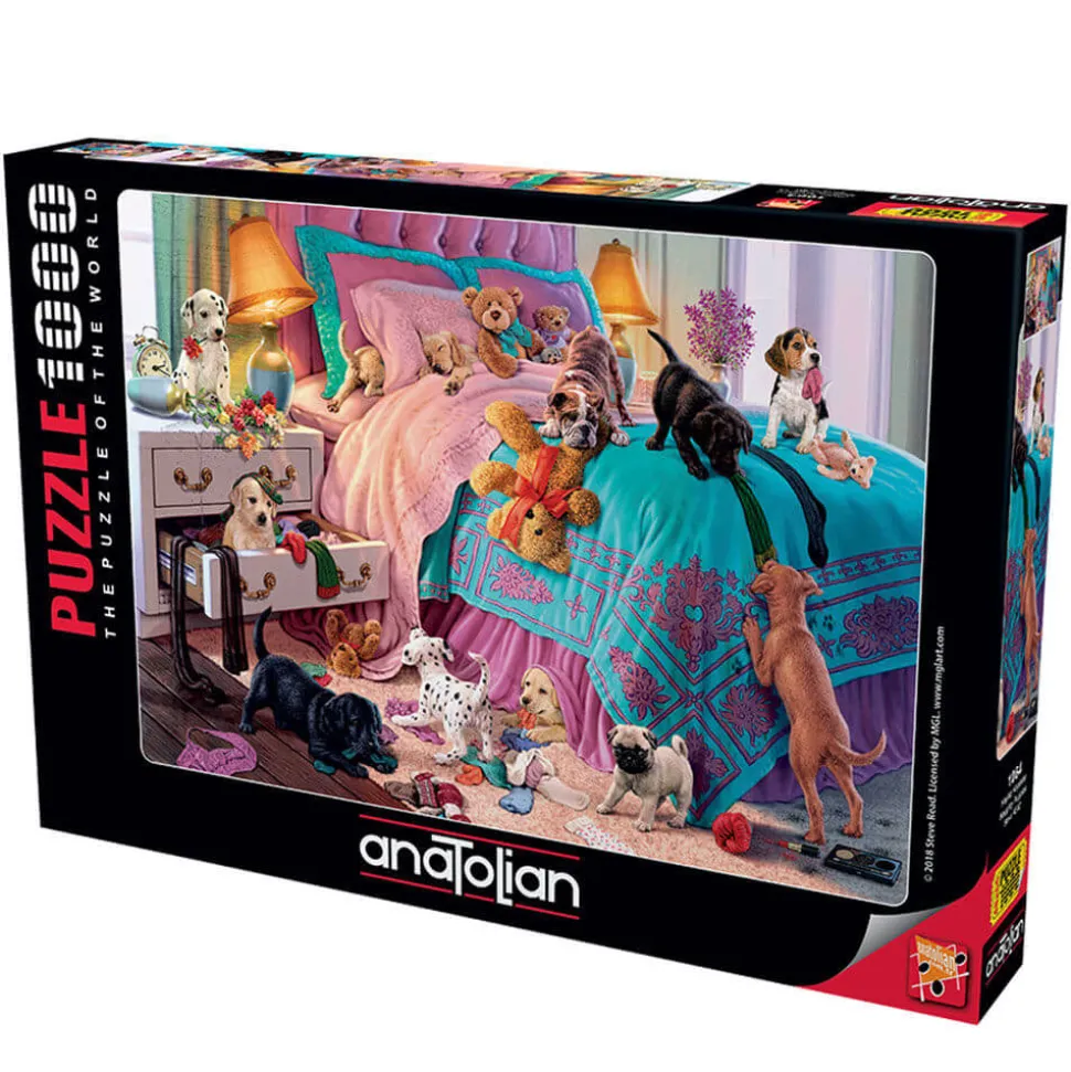 Ces chiots ont l’air de bien s’amuser ! Ils ont mis sans dessus dessous la chambre de leur maîtresse. Certains sont cachés dans les placards, pendant que d’autres mangent les chaussettes ou jouent avec des collants. Il est trop tard pour le pot de fleur et le maquillage déjà tombés par terre. Espérons que leur maîtresse ne tarde pas trop à rentrer ! Ce puzzle de la marque Anatolian est sur le thème des chiens. Il est composé de 1000 pièces et est conçu en carton. De difficulté moyenne, il mesure une fois assemblé 48 cm de longueur pour 66 cm de largeur et est adapté pour les plus de 12 ans.