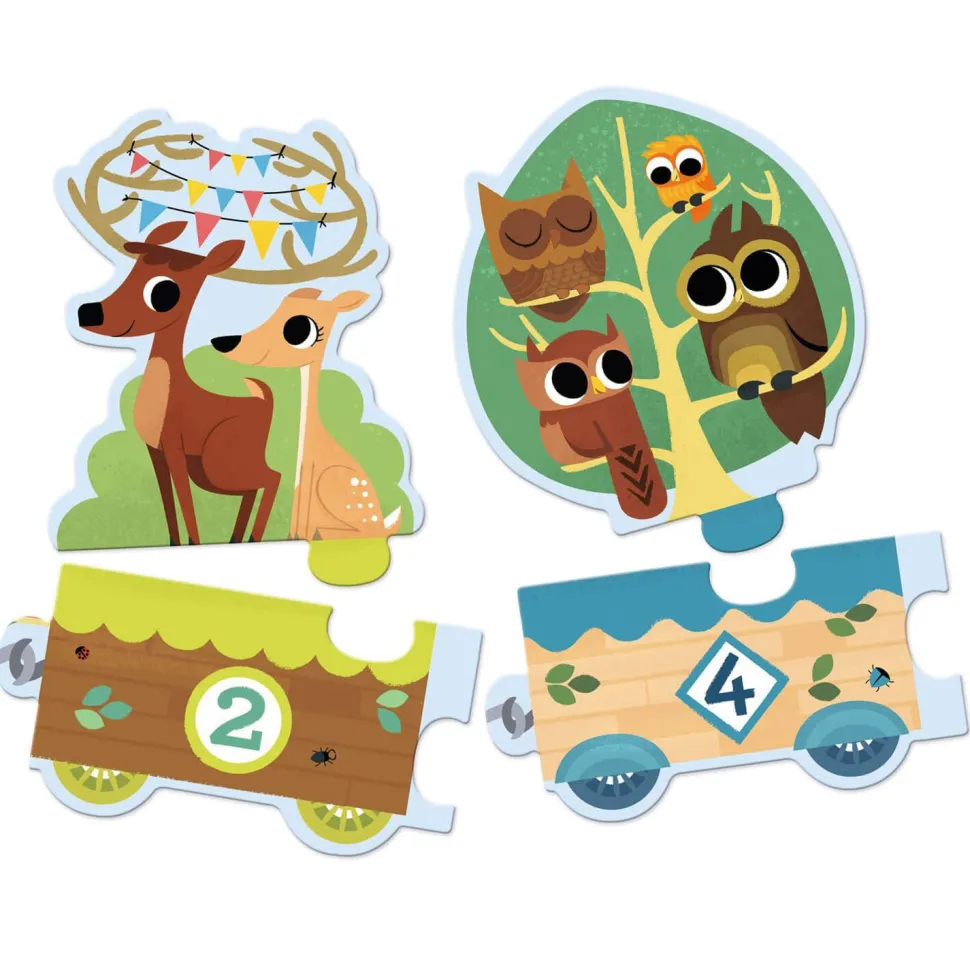 Un puzzle frise de 20 pièces, de la marque Djeco, à remettre dans l’ordre pour apprendre les chiffres, les quantités et la suite numérique grâce au train des animaux de la forêt.