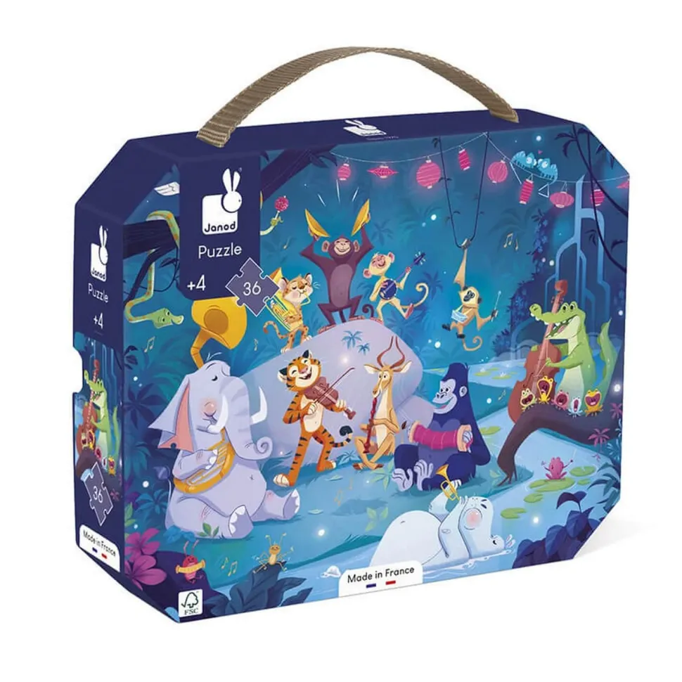 Tendez l’oreille, il semble qu’une fête bat son plein au milieu de la jungle ! De joyeux animaux se sont rassemblés pour faire la fête en musique et donner vie à ce puzzle en carton de 36 pièces.