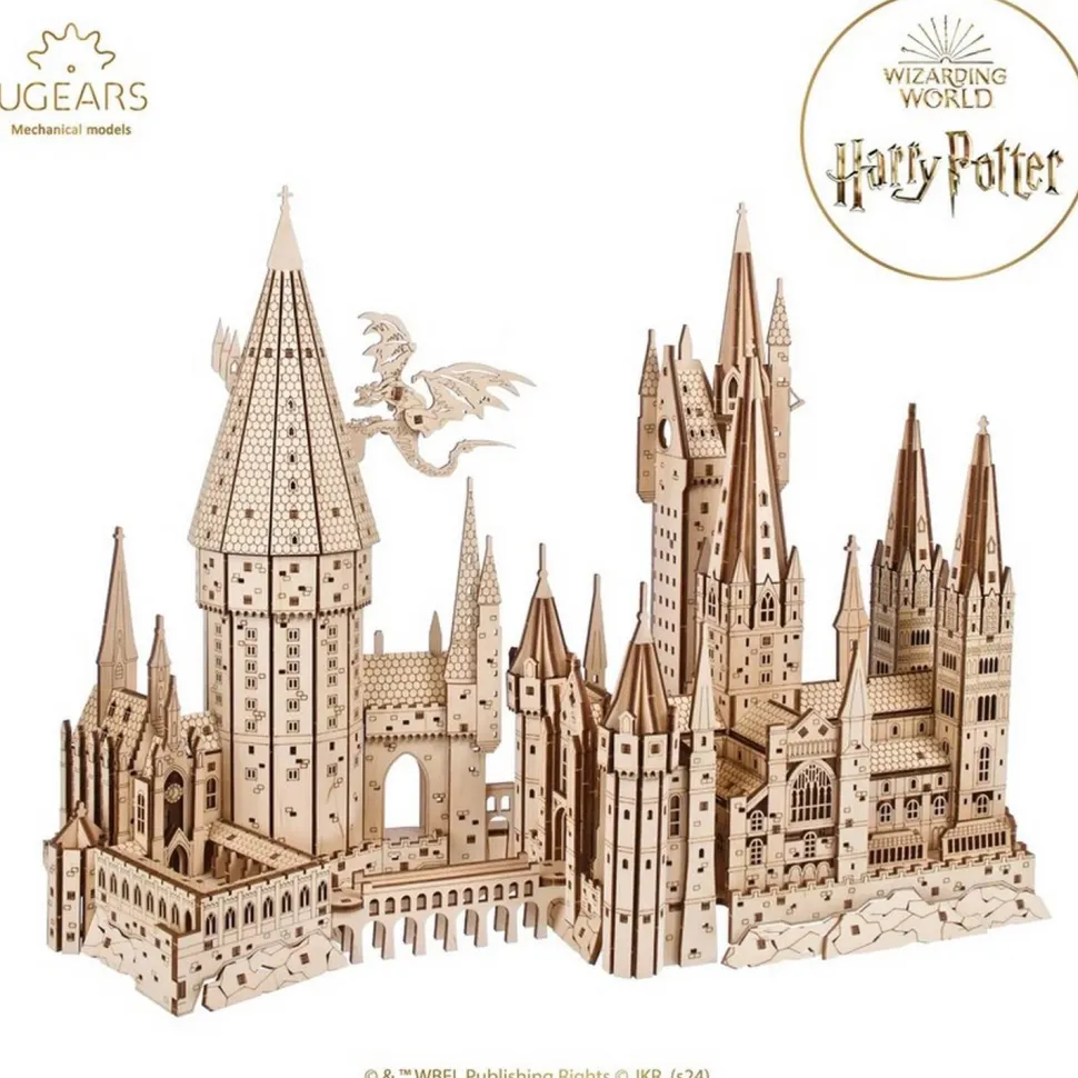 La face avant de la maquette présente en détail les bâtiments, les tours, les tourelles et les parapets de l’école de sorcellerie Poudlard, y compris les épis de faîtage, les cloîtres, les fenêtres découpées et les gravures au laser qui reproduisent l’aspect des rochers, de la maçonnerie et des tuiles en ardoise sur les toits. L’arrière de la maquette présente une coupe du château pour un design plus compact permettant de le placer contre un mur, qui montre des détails intérieurs cachés tels que la grande salle, l’escalier de la tour, les chambres et les cours intérieures. Un dragon aux ailes mobiles est suspendu à la tour principale, rappelant la scène du film « Harry Potter et la coupe de feu » où Harry est poursuivi par un dragon crachant du feu.