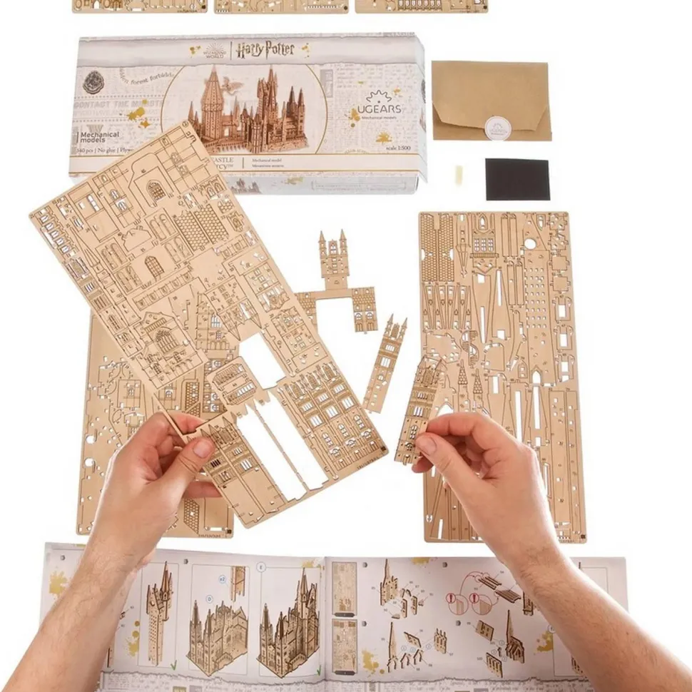 La maquette est d’un niveau de difficulté « Moyen » avec 340 pièces et un temps d’assemblage estimé à 6 heures. Les pièces sont prédécoupées au laser dans des planches de bois composite de qualité artistique. Pour les assembler, il suffit de détacher les pièces des planches et de les emboîter en suivant les instructions détaillées et illustrées disponibles en 11 langues (anglais, allemand, ukrainien, français, polonais, espagnol, portugais, japonais, italien, chinois et coréen). Aucune colle ni aucun outil spécial n’est nécessaire pour construire le château de Poudlard™ : tout ce dont vous avez besoin pour l’assemblage est inclus dans la boîte.