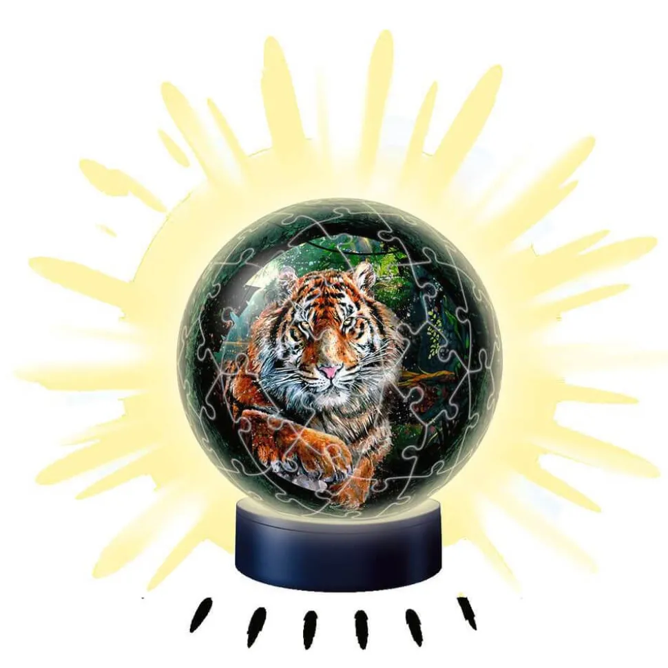 Puzzle 3D rond et lumineux représentant un tigre Pour emboîter les pièces, il suffit de suivre l’ordre des numéros et le sens des flèches indiquées au verso des pièces. Il n’y a pas besoin de colle. avec son socle lumineux, il se transforme en véritable lampe qui s’allume et s’éteint à chaque claquement de mains de vos enfants.