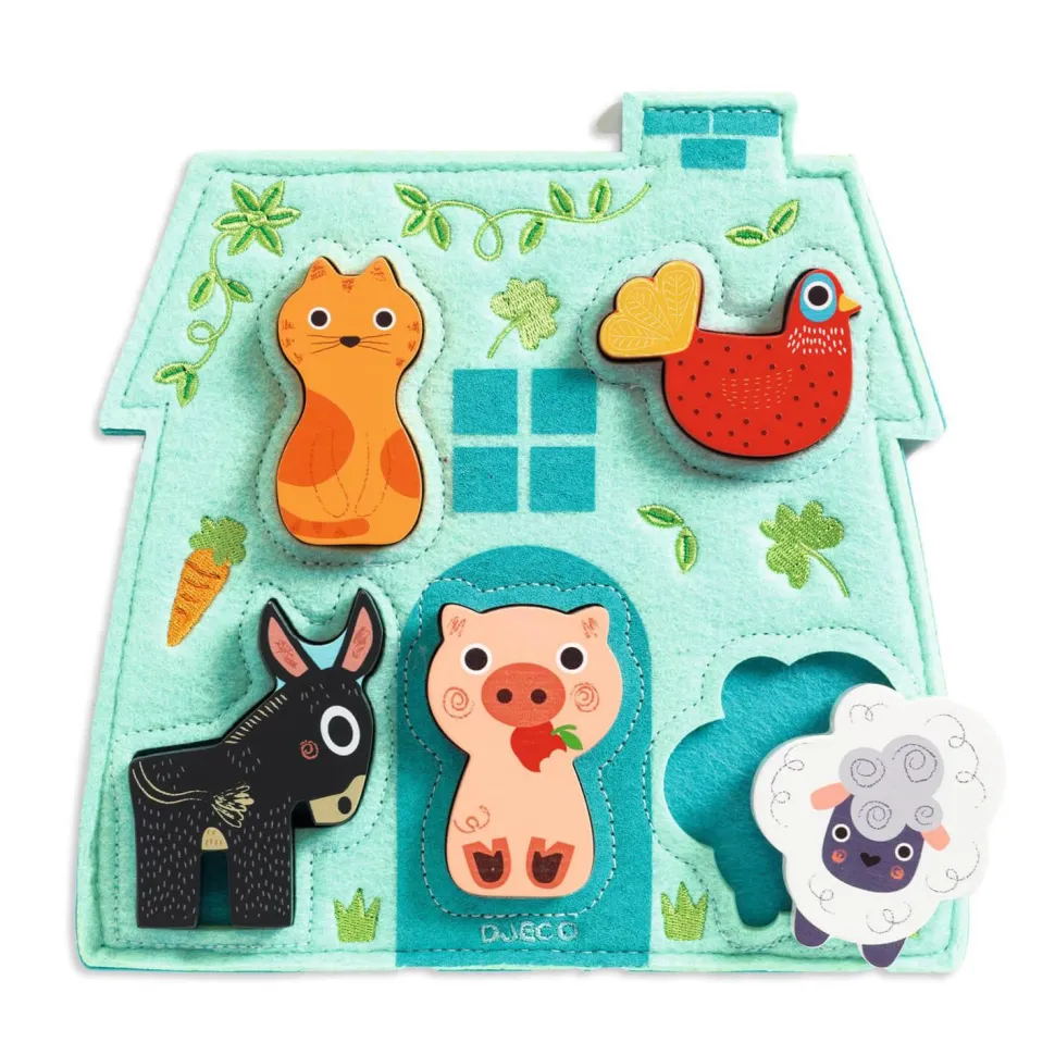 Une jolie base en forme de ferme en feutrine brodée et imprimée et 5 animaux en bois à replacer.