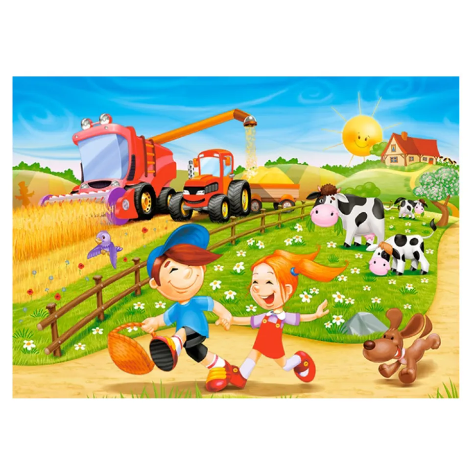 Une jolie petite illustration joyeuse qui donne l’envie immédiate de reconstituer ce puzzle !Le puzzle que vous allez devoir constituer est une image d’un été à la campagne. Découvrez deux bambins qui courent main dans la main dans un chemin accompagnés de leur chien. Mais aussi, observez des vaches broutant l’herbe, un oiseau violet, des arbres fleuris, un soleil rayonnant et au fond de cette illustration, une jolie ferme aux toits rouge.Une panoplie de couleurs et d’animaux de la ferme qui sauront captiver votre enfant !Ce puzzle Castorland illustre un univers de la ferme. C’est un puzzle de niveau facile composé de 60 pièces, conçu en carton et qui est adapté pour les plus de 5 ans. De format paysage, il mesure une fois assemblé 32 cm de longueur et 23 cm de largeur.
