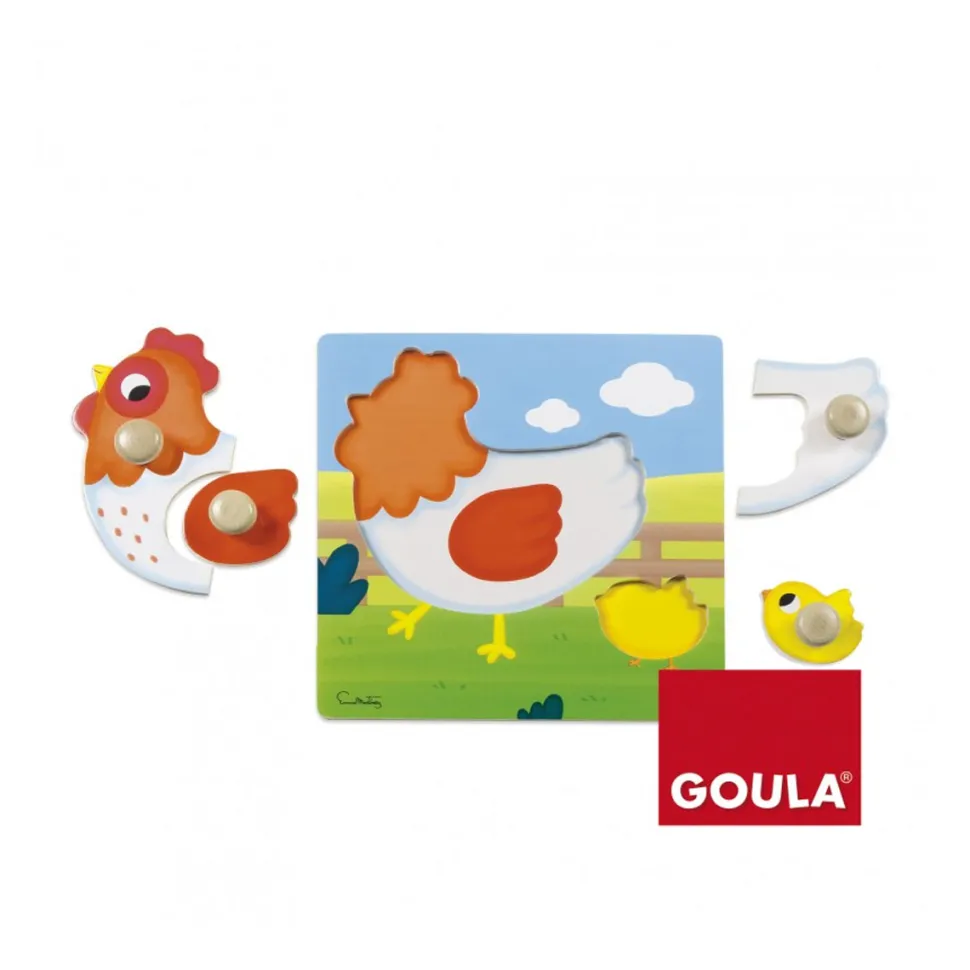 Retrouvez ce très joli petit puzzle en bois de 4 pièces destiné aux enfants à partir de 1 an.Contenu :- 1 base en bois- 4 pièces : la tête, l’aile, l’arrière du corps de la poule et le petit poussin.Un puzzle de 4 pièces en bois avec des gros boutons qui se laisseront facilement attraper par les petites mains de votre petit garçon ou de votre petite fille.Découvrez cette jolie poule blanche, rouge et orange se promenant dans son enclos avec son petit poussin. L’encastrement est facile : l’enfant se laisse guider par la couleur et la forme. Dans un premier temps, il aura très certainement besoin de votre aide, mais il réussira rapidement à le faire seul et en sera très fier !!!Cette activité va aider votre enfant à développer sa concentration, sa patience ainsi que sa motricité fine.Dimensions : 22 x 22 x 2.5 cm