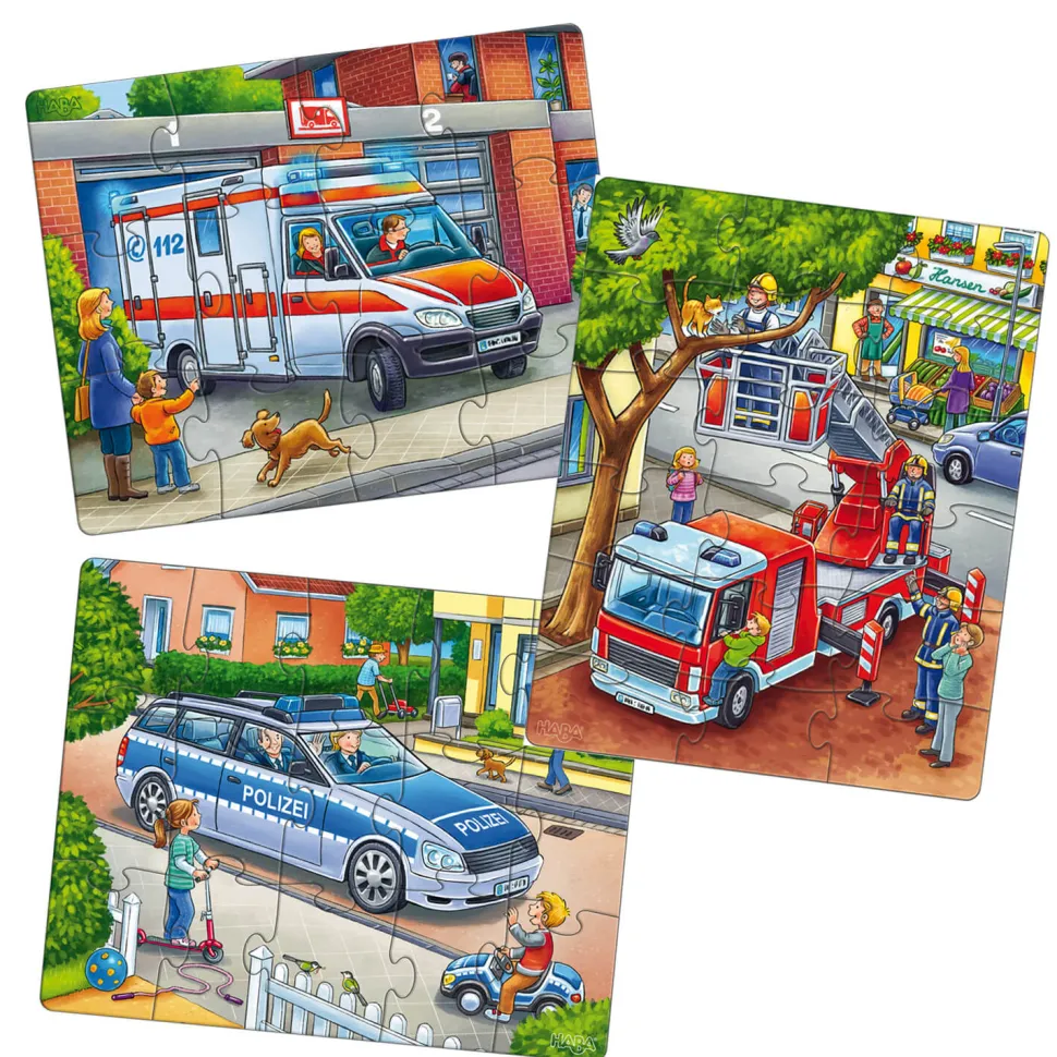 Ce coffret Haba s’adresse aux jeunes fans de puzzles ET de véhicules de secours . La première image à reconstituer montre une ambulance sortant de l’hôpital, le second une voiture de police (allemande si l’on se fie aux inscriptions sur la carrosserie) et le dernier un camion de pompier en pleine intervention. La grue est déployée et un courageux pompier s’apprête à recueillir un petit chat bloqué au sommet d’un arbre. Ces trois puzzles fabriqués en Pologne se constitués respectivement de 12, 15 et 18 pièces. Accessibles aux enfants à partir de 3 ans avec leurs pièces en carton pensées pour les petits puzzleurs débutants, ils mesurent une fois assemblés 25 cm de longueur pour 20 cm de largeur.