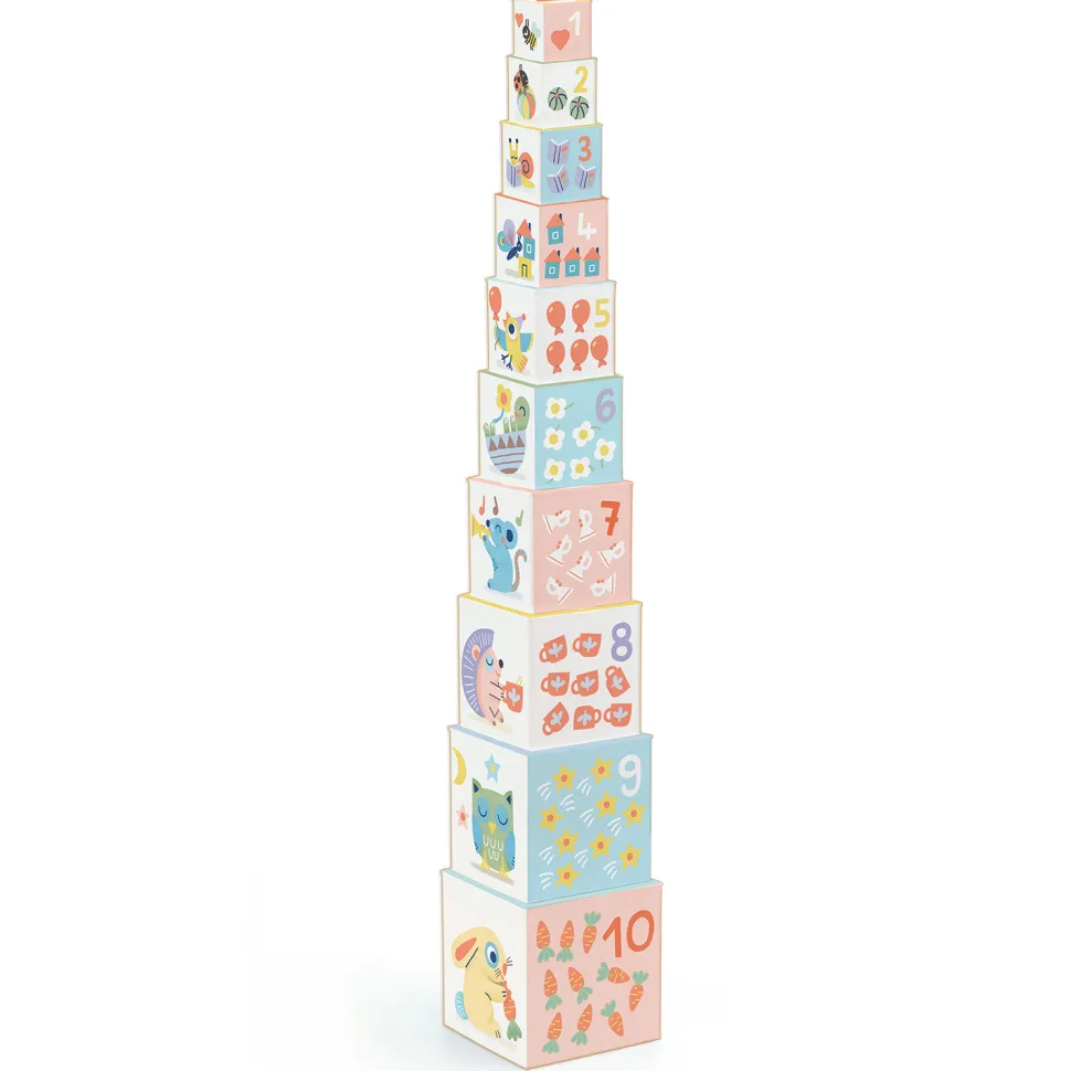 Empilez et observez cette jolie pyramide !Cette pyramide est constituée de 10 jolis blocs colorés en carton épais dans les tons pastels.En empilant les cubes pour construire sa pyramide, votre enfant découvre différents animaux et insectes, plus les cubes sont petits plus les animaux sont petits. Il commence par disposer le lapin, hibou, le hérisson, la souris, la tortue, l’oiseau, le papillon, l’escargot, la coccinelle et au sommet de sa tour, une abeille.Sur les autres 3 faces on voit ces différents animaux : – Sur une face, par deux en train de se câliner- Sur une autre face, jouant avec un ballon, émettre de la musique, se reposer….- Sur une autre face, on peut apprendre à compter jusqu’à 10, avec des illustrations pour pouvoir dénombrer.Avec ce jeu de cubes à encastrer et à empiler, votre enfant s’amusera pendant des heures !Ce jeu de construction va encourager votre enfant à développer sa coordination et son sens de l’observation.