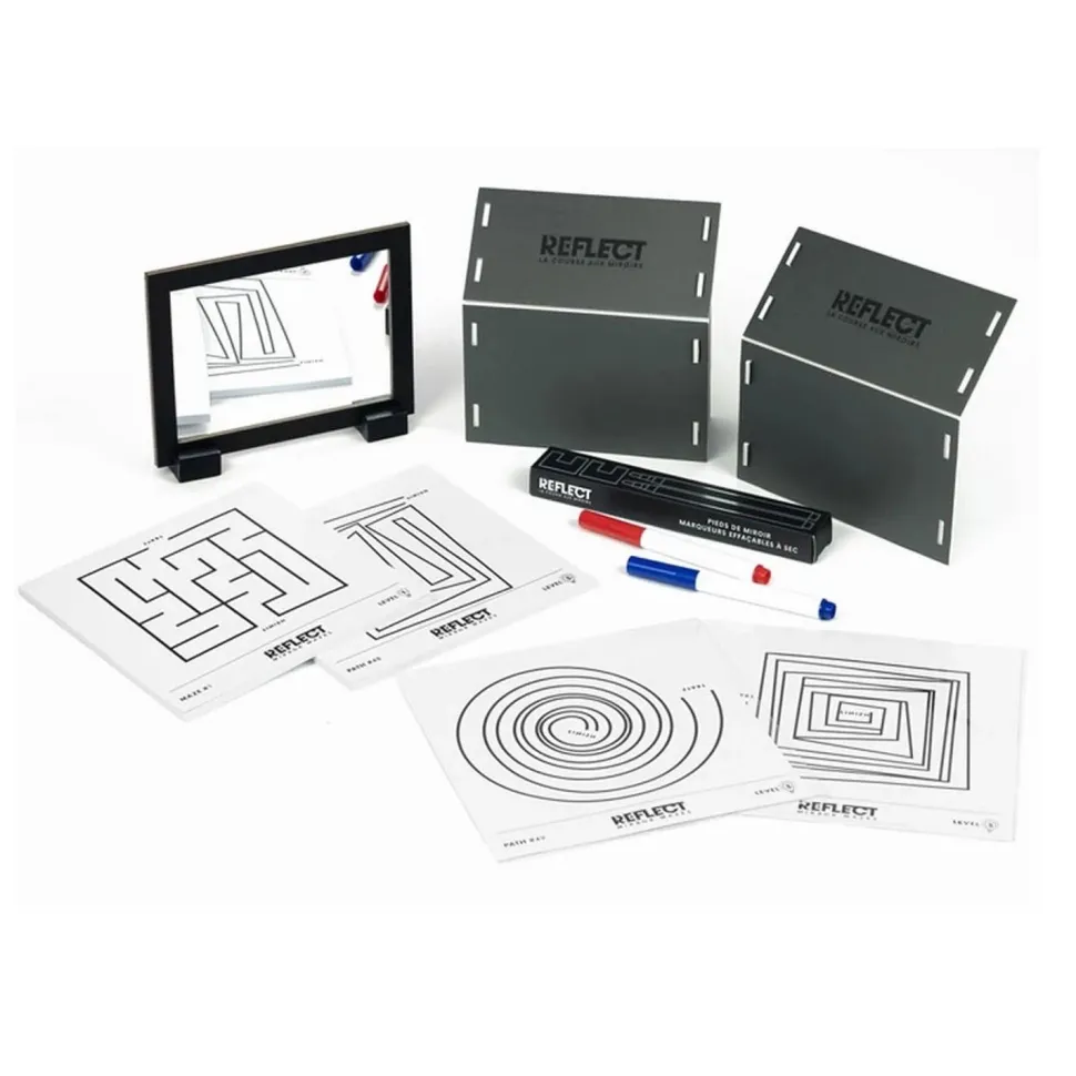 Le jeu Reflect est un jeu original où vous allez essayer de tracer votre chemin pour sortir d’un labyrinthe. Mais attention tout est inversé dans le miroir ! Vous allez vous perdre… En vous appuyant uniquement sur le reflet du miroir, vous essayerez de battre votre adversaire en sortant le premier du labyrinthe ou en traçant votre chemin sans toucher les lignes du dessin qui encadrent le couloir. Les cartons sont réutilisables grâce aux feutres effaçables, vous pourrez donc recommencer à l’infini…