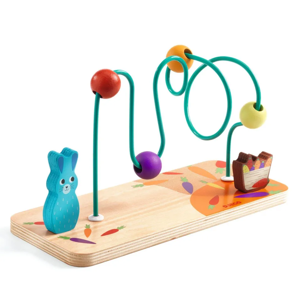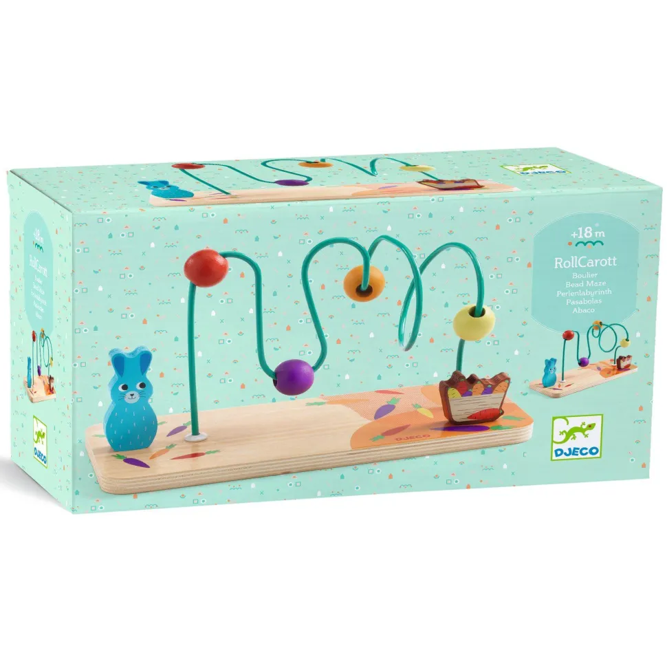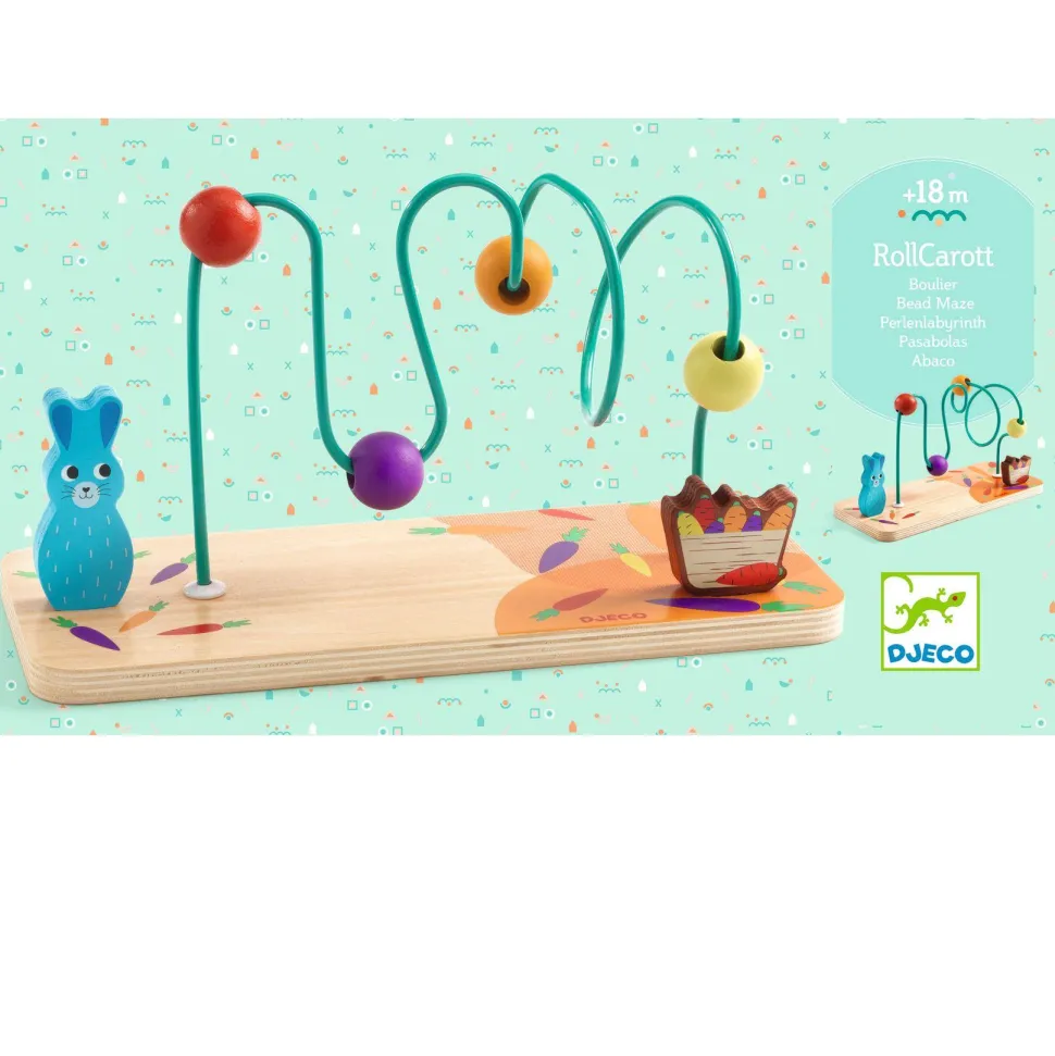 Découvrez le jeu RollCarott de la marque Djeco. RollCarott est un boulier en bois innovant destiné aux enfants dès 18 mois, conçu pour éveiller la motricité fine et l’agilité des tout-petits. Il se compose d’une tige métallique équipée de plusieurs boucles et loopings, sur laquelle 4 perles colorées peuvent se déplacer librement. L’enfant prend plaisir à faire glisser, tourner et monter les perles sur la tige, en les faisant passer d’un côté à l’autre, pour relier le lapin à ses carottes. Ce jeu permet à l’enfant de manipuler les perles dans un mouvement horizontal et vertical, favorisant ainsi la coordination œil-main, tout en l’initiant à la compréhension des déplacements dans l’espace. Un jeu simple mais captivant qui allie motricité et amusement.