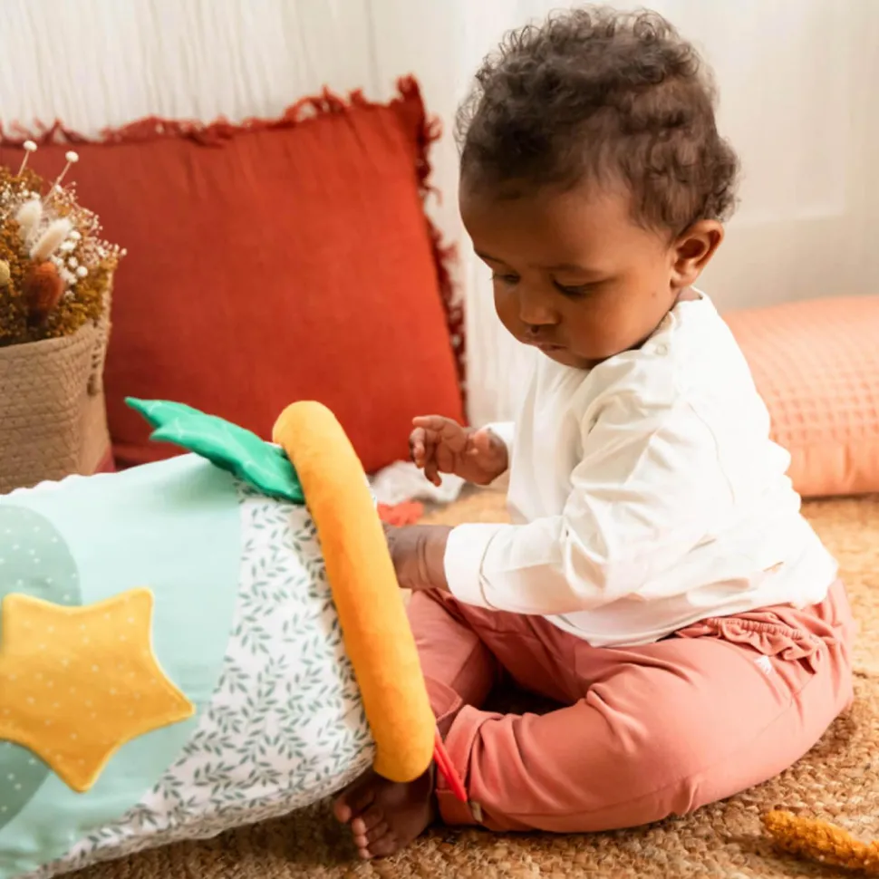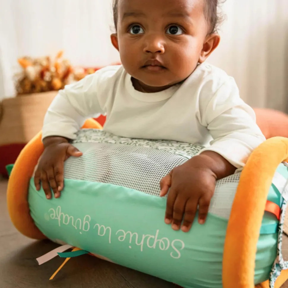 Ce rollin’ en tissu imprimé avec des illustrations de Sophie la girafe et de ses amis est conçu comme un cylindre sur lequel bébé pourra s’allonger, s’asseoir et chevaucher en toute sécurité grâce à ses rebords molletonnés.