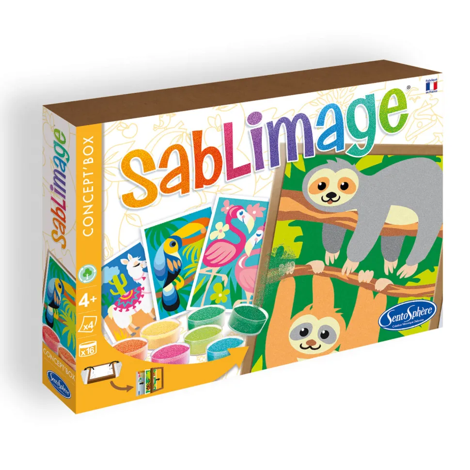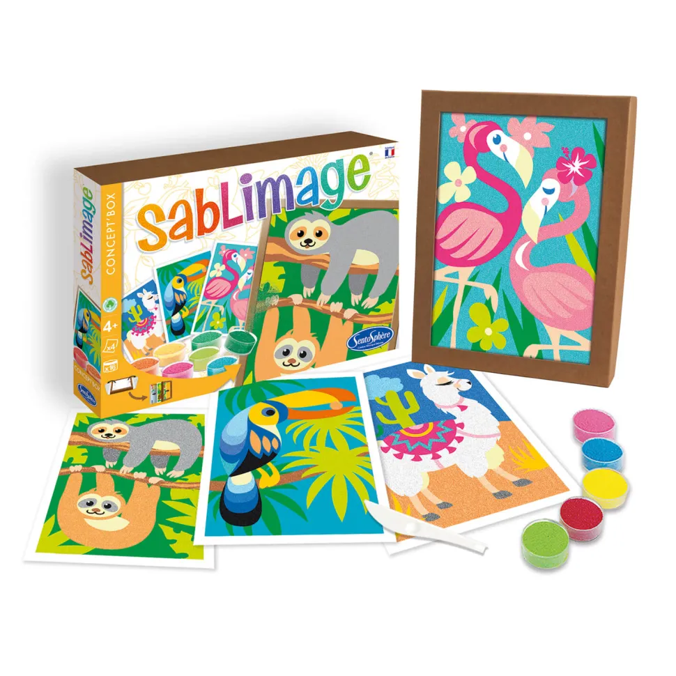 Découvrez ce coffret Sablimage Animaux sud-américains. Retrouvez dans ce coffret 4 tableaux représentant notamment des paresseux, un toucan, un lama ou encore des flamants roses. Choisissez votre tableau, sortez votre sable et c’est parti pour un joli moment de détente et de loisir créatif. Ce coffret est adapté pour les enfants à partir de 4 ans. Cette gamme d’activité artistique a été conçue pour que de très jeunes enfants puissent réaliser de jolis tableaux naïfs sans se salir. Pour cela, il suffit de décoller les surfaces préencollées et de les saupoudrer avec les différents sables proposés. Une activité ludique et artistique idéales pour développer la créativité, l’habileté manuelle et le sens des couleurs. De plus, grâce à son format « Concept’ box » la boîte se transforme en cadre pour pouvoir exposer son oeuvre.Ce coffret contient : – 16 à 18 petits pots de sable- 4 tableaux- 1 petit couteau- Notice.Comptez 2 à 3 heures d’activité pour ce coffret.