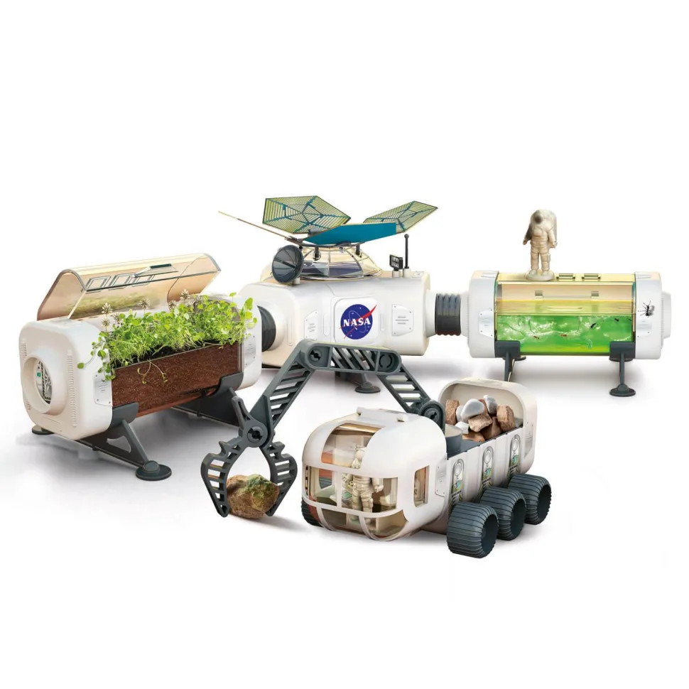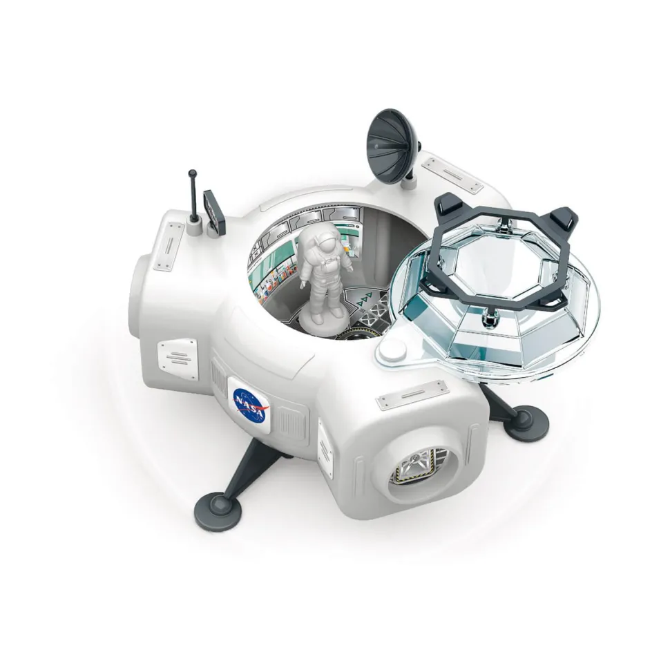 Une station spatiale futuriste de la NASA avec un rover explorateur à assembler et plein d’expériences stimulantes, pour un voyage passionnant à la découverte des secrets de la planète rouge.La station spatiale est composée d’éléments modulables et peut être assemblée selon différentes combinaisons.En se mettant dans la peau d’un véritable astronaute, l’enfant pourra expérimenter à l’intérieur des modules des activités de botanique et d’observation des êtres vivants.Avec le rover spécial, il pourra partir à la découverte de Mars pour collectionner des échantillons de sol et en étudier la composition !