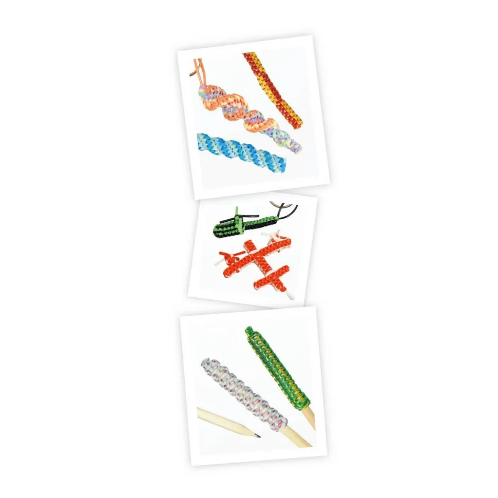 12 modèles de scoubidous à tisser ainsi que des fils supplémentaires pour faire ses propres créations!