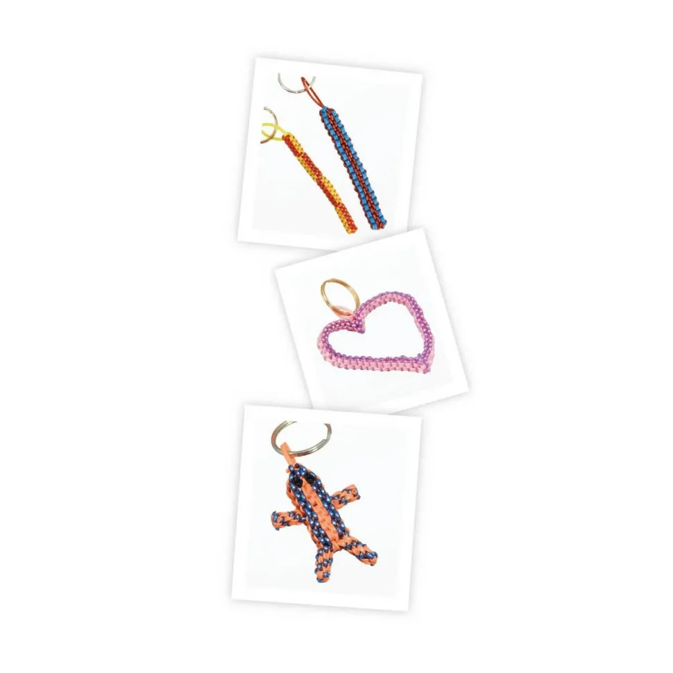 Contient: un assortiment de 55 fils scoubidous, 15 anneaux de porte-clés et 2 crayons de papier.