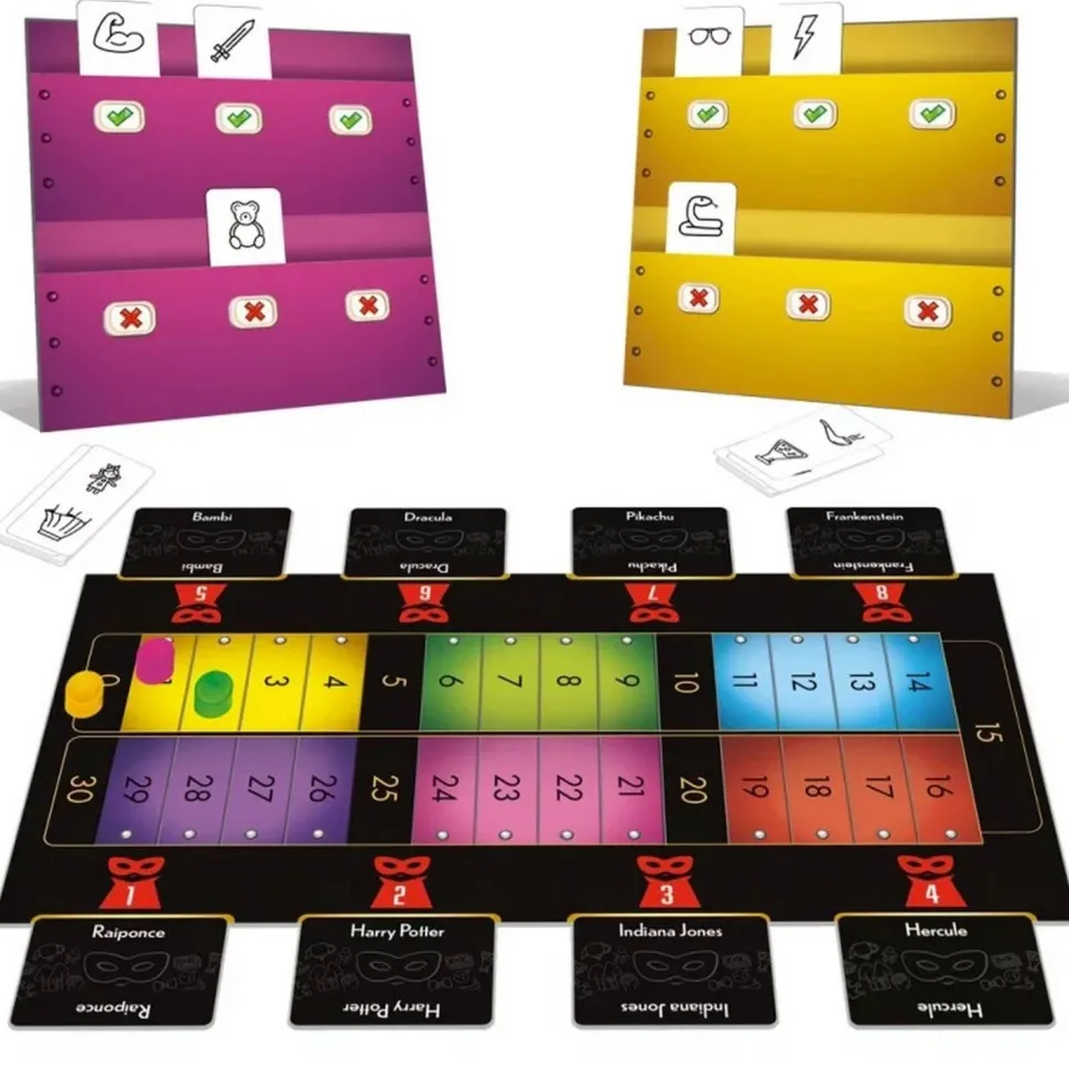 Contenu de la boite :8 boîtiers personnels, 64 cartes Vote (8 par joueur), 8 cartes Mystère, 90 cartes Picto recto-verso, 150 cartes Personnages recto-verso, 1 plateau de score, 8 pions de couleur, 8 jetons 30, 1 livret de règles.
