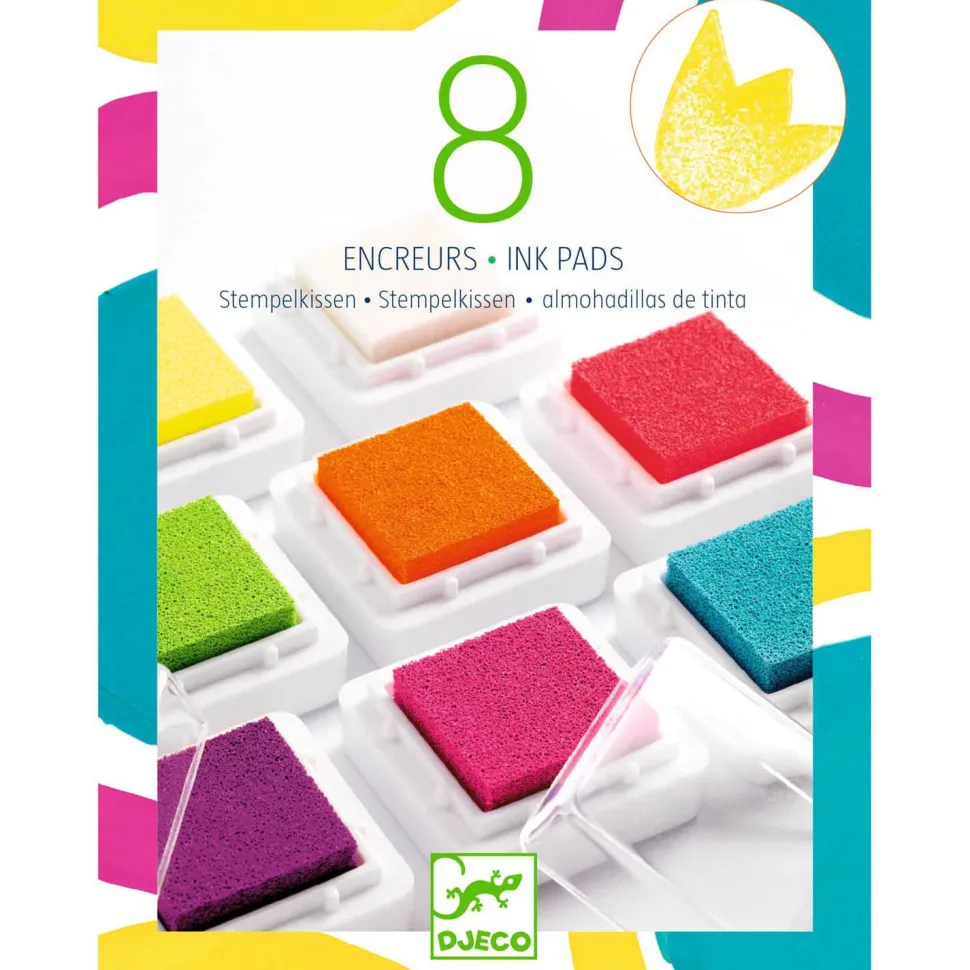 Contenu : 8 encreurs aux coloris pop assortis et 1 tapis nettoyeur rangé dans une boîte plastique transparente.