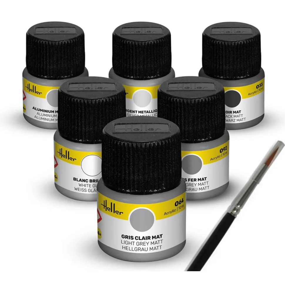 Ce kit contient six couleurs acryliques de 12 ml et un pinceau.