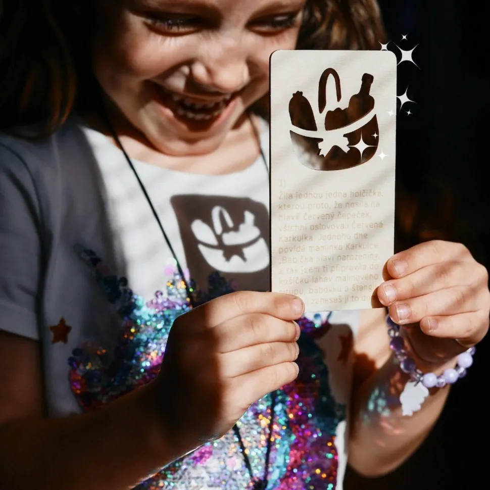 … Un extrait d’histoire est imprimé sur chacune des huit cartes en bois numérotées et le motif du spectacle est découpé pour être projeté sur une surface lumineuse. Lumière du soleil, lampe de poche, lampe de bureau, bougie, smartphone… Avec nos marionnettes à ombres de poche, les ombres peuvent être projetées n’importe où et les contes de fées peuvent être racontés comme des histoires. Conseil pour l’extérieur : observez les personnages en mouvement dans la nature.