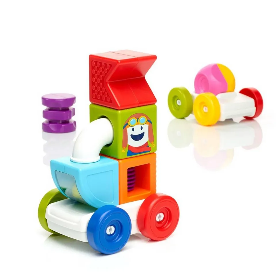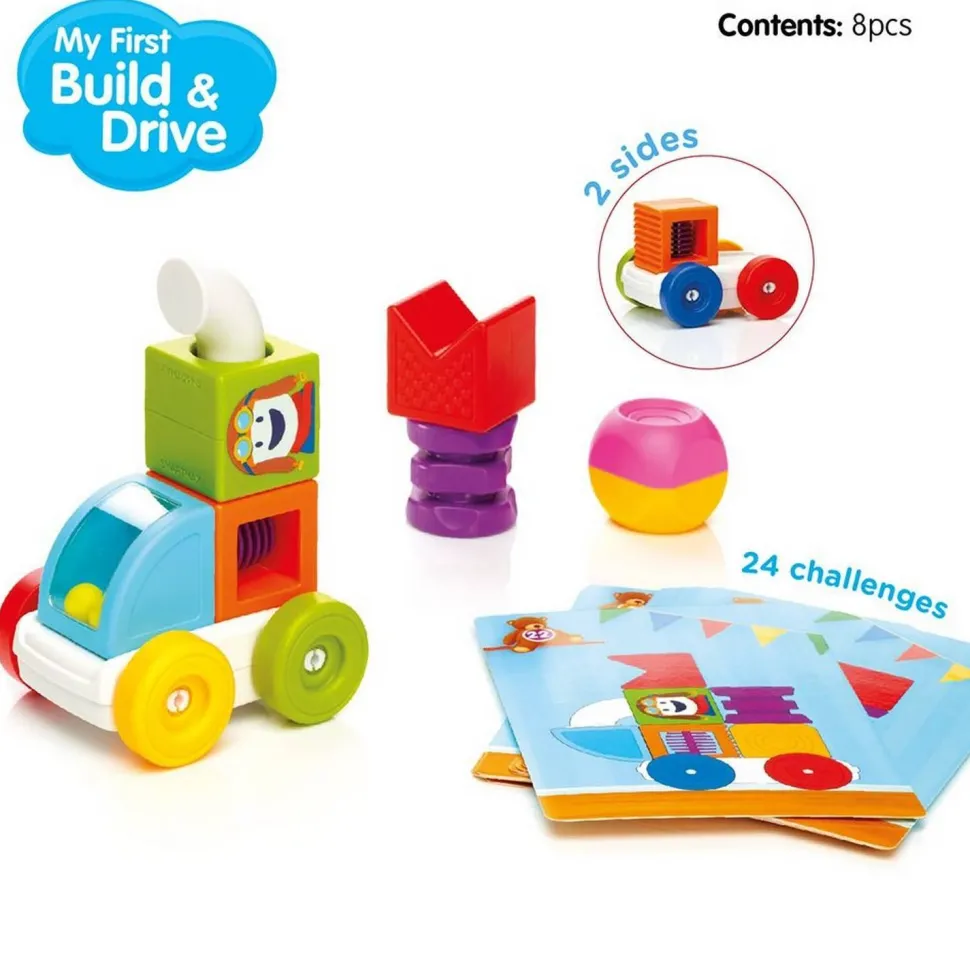 Retournez le socle du véhicule pour réaliser des défis plus difficiles. Devenez incollables sur le magnétisme, les couleurs, les formes, les angles ainsi que les concepts de dessus, dessous, gauche et droite. Combinez « My First Build & Drive » avec tous les autres SmartMax et développez votre motricité fine, équilibre et créativité. Des constructions à l’infini garanties !