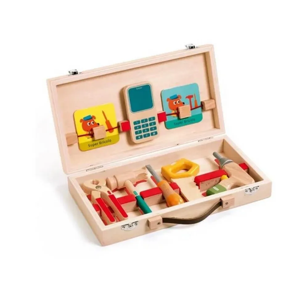 Cette boîte contient tous les outils en bois idéals pour dépanner comme les grands. Des outils de qualité accompagnés de cartes qui associent une situation et l bon outil que doit utiliser votre jeune bricoleur pour effectuer le réparation. Une activité manuelle, qui va développer l’imagination et la motricité de votre futur super bricolo !