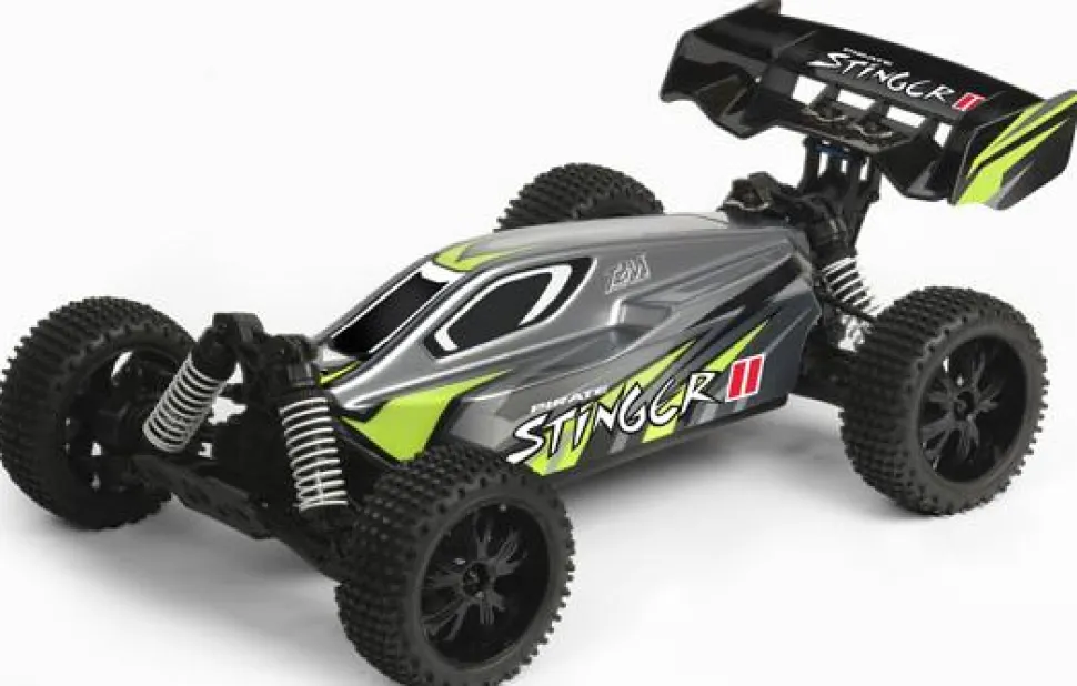 Ce modèle est prêt à rouler avec carrosserie en polycarbonate peinte et décorée. Le Pirate Stinger II est un buggy robuste et performant. Son puissant moteur type 550 et sa transmission 4×4 entièrement sur roulements à billes avec deux différentiels lui permettent d’atteindre 45 km/h. La puissance est gérée par un variateur électronique (Avant/Arrière/ Frein) pouvant être alimenté par pack Li‐Po 2S ou Ni‐MH 5 à 9 éléments. Les cardans avant et arrière sont en acier traité. La suspension à quatre roues indépendantes et quatre amortisseurs hydrauliques et les pneus tout terrain Hi‐Grip Mini‐Blocks lui permettent d’évoluer à haute vitesse en terrain accidenté. Pour adapter le Pirate Stinger II à tout type de situation, Il est possible de modifier l’empattement (335 ou 338mm) la position des amortisseurs et d’ajuster leur dureté au moyen d’une molette de réglage de précontrainte du ressort. Aileron en nylon à incidence réglable assorti. Avec le Pirate Stinger II, découvrez la robustesse et les performances d’un véritable buggy 4×4 radiocommandé !