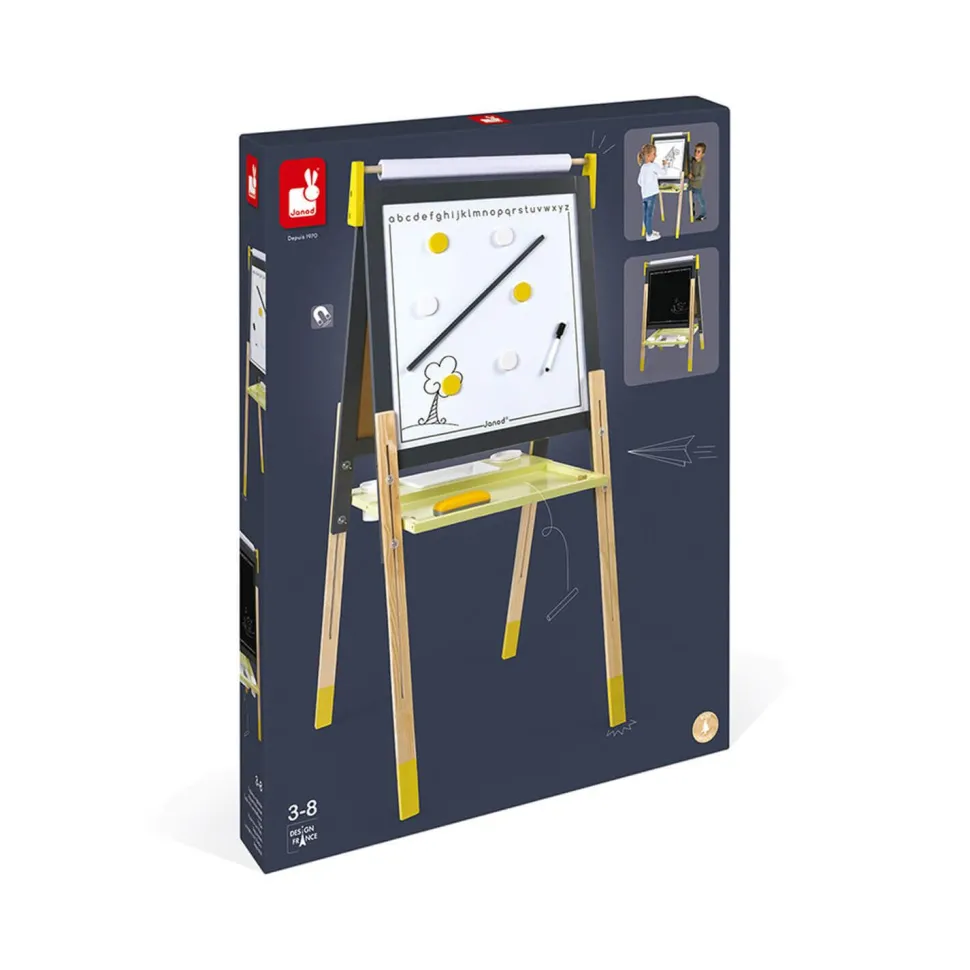 Bois : MDF (ardoise noire), pin (montants, magnets, tablette verte, règle), plastique (bac, cubs, brosse, crayon). Boite couleur fermée.