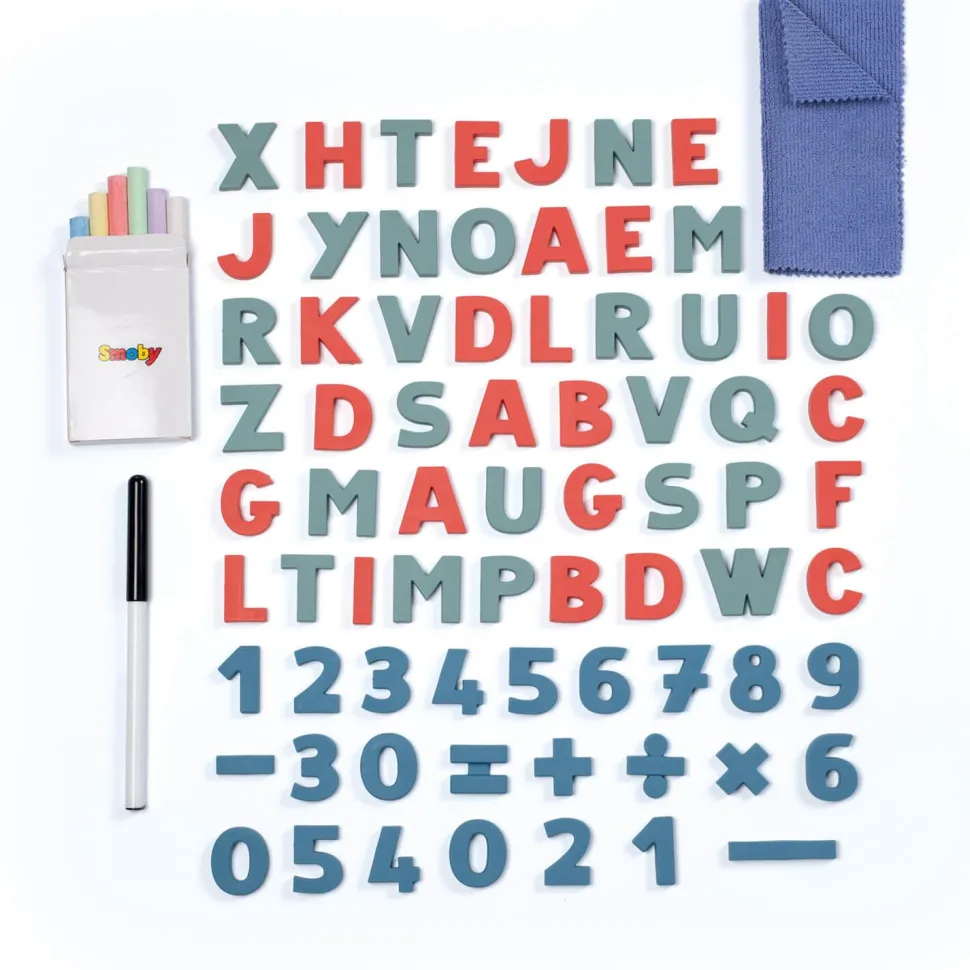 80 accessoires inclus : 1 feutre effaçable, 6 craies de couleur, 72 lettres et chiffres magnétiques et 1 chiffonnette !