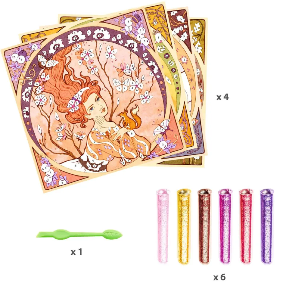 Une activité de tableaux à pailleter, de la marque Djeco, aux illustrations inspirées du style du grand maître de l’Art Nouveau, Alfons Mucha.