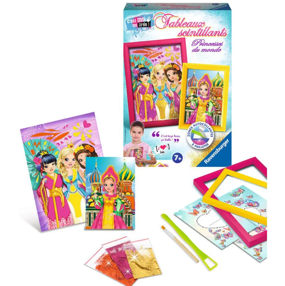 Plongez dans l’univers créatif des Princesses du Monde !Découvrez ce coffret comprenant deux tableaux avec plusieurs princesses aux différents coins du Monde joliment vêtues par de majestueuses robes pétillantes. Des princesses qui viennent de Chine, d’Inde ou d’Europe. A l’aide de la spatule verte, vous n’aurez plus qu’à dévoiler les zones autocollantes, appliquer sur les zones les paillettes rose, orange ou or avec le pinceau et finir par encadrer ces tableaux scintillants dans les cadres jaune et rose. Une création à exposer dans la chambre de votre enfant où il sera fier de la montrer à son entourage.De beaux tableaux scintillants à créer pour développer l’imagination de votre enfant dès l’âge de 7 ans.Contenu du coffret : – 2 tableaux autocollants imprimés à pailleter- 2 cadres et leur support- 3 sachets de paillettes- 1 outil pour dévoiler les zones encollées- 1 pinceau- 1 notice détaillée