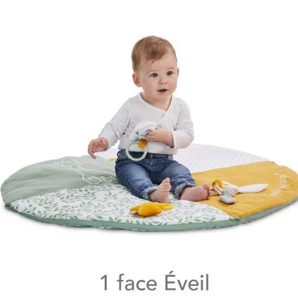 Une face « éveil » : bébé développe son éveil et sa motricité grâce aux nombreuses activités qui l’entourent sur les arches et sur le tapis : miroir, grelot, anneau de dentition, papier froissé…