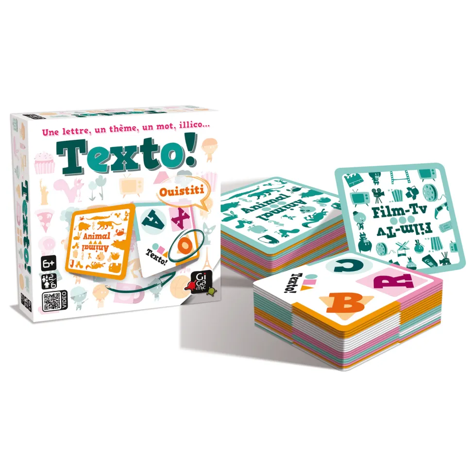 Dégainez des mots aussi vite qu’un retournement de carte et devenez le roi de Texto! Une carte présente 3 lettres colorées. À chaque tour, on va retourner une carte qui va dévoiler un thème. Ce thème sera écrit sur un fond de couleur. Ce fond indiquera alors la couleur de la lettre qui sera nécessaire pour répondre. Il faudra donc annoncer le plus rapidement possible un mot correspondant au thème, et commençant par la lettre correspondante ! Qui aura le plus de vocabulaire ? Qui donnera les réponses les plus amusantes ? Qui fera rire tout le monde grâce à ses erreurs inattendues ?Nombre de joueurs : entre 2 et 6Durée d’une partie : 10 minutesÂge recommandé : à partir de 6 ansAuteur : Treo Games DesignerIllustrations : Stéphane EscapaCe qui se trouve dans la boîte : – 60 cartes- règle du jeu