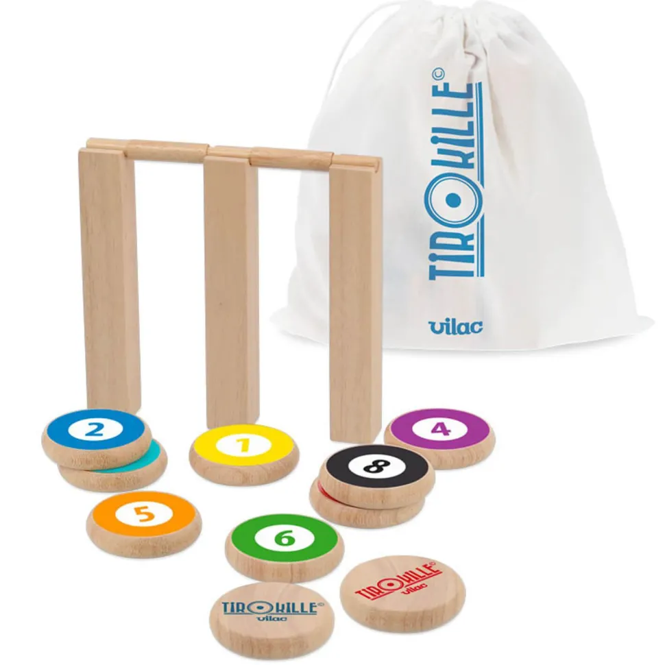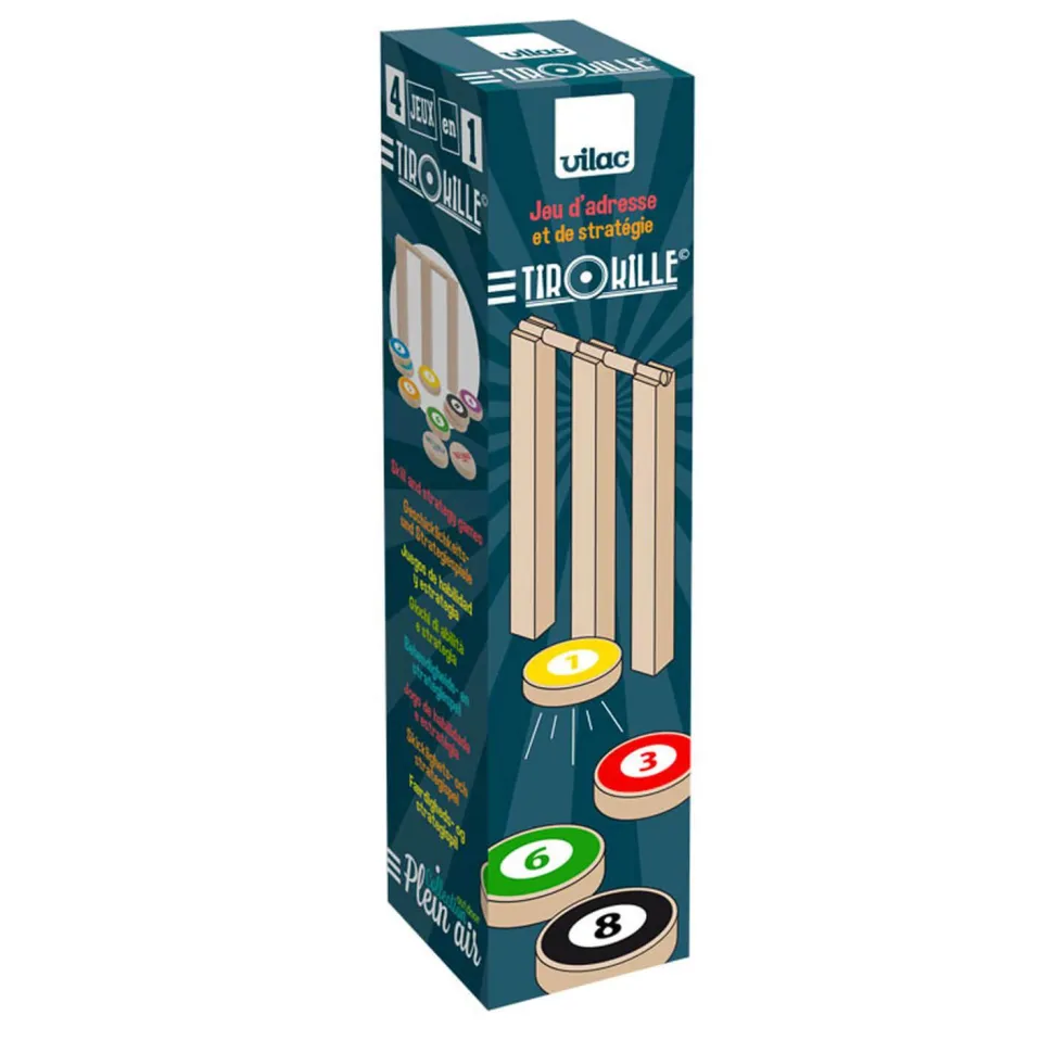 Vilac vous propose pourtant une création originale, le TirOkille, subtile mélange du jeu de pétanque, du jeu de quilles et du jeu de palet. Dégommer l’obstacle, s’en approcher sans le toucher ou passer en dessous, de nombreux challenges attendent les joueurs, petits et grands pour relever les défis des 4 règles du jeux différentes qui assureront l’ambiance en famille et entre amis !