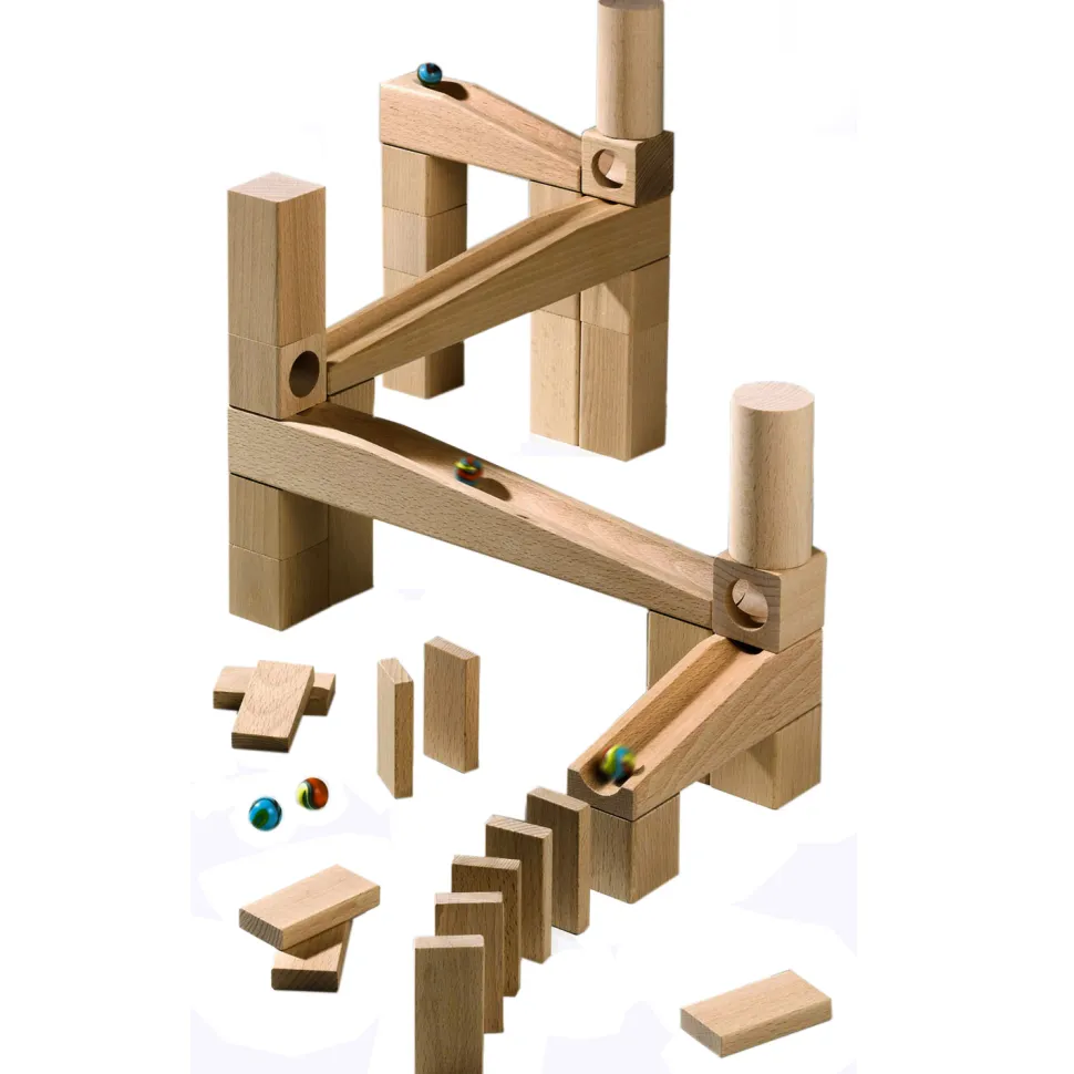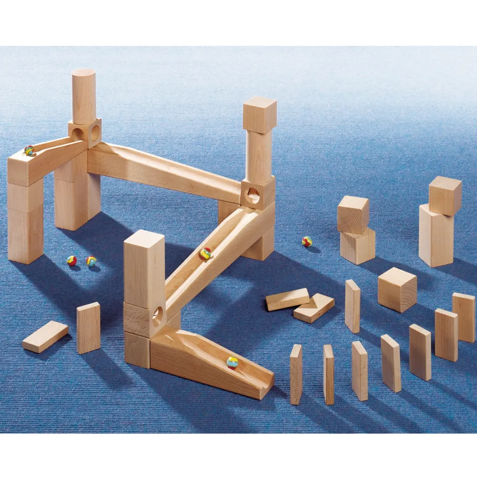 Toboggan à billes pour débutants de HabaLes toboggans à bille sont toujours fascinant.HABA démarre ici un système complet, qui peut facilement être compliqué ou agrémenté de surprises…Contenu de la boîte : – 2 rampes ( 32 cm ) – 2 rampes ( 16 cm ) – 12 cubes ( 8 x 4 x 4 cm ) – 5 cubes ( 4cm de côtés ) – 3 éléments de déviation ( 4 cm de côtés ) – 2 colonnes ( 8 cm ) – 12 dominos – 6 billes en verre – 1 livret de 24 pages de conseils et d’astuces.Les éléments sont en hêtre massif.