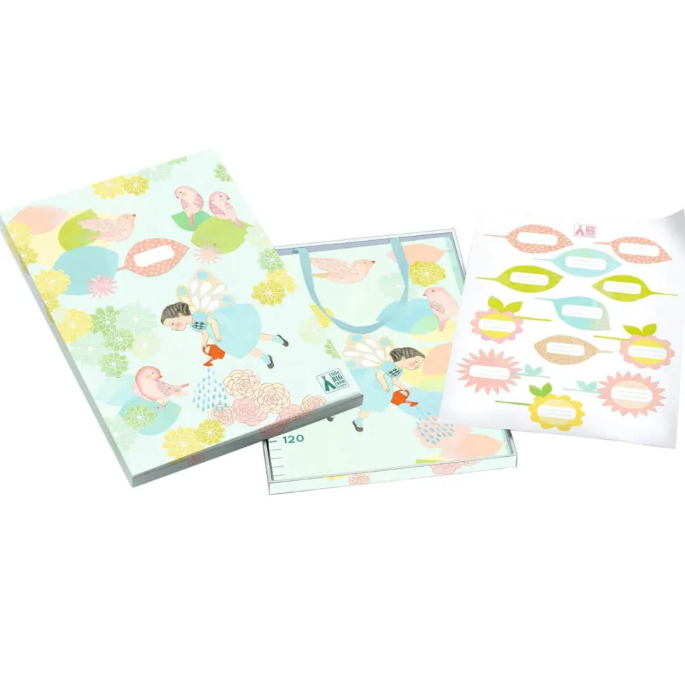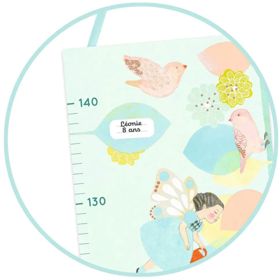 Contenu : 1 toise illustrée de 90 x 20 cm avec un ruban coloré pour l’accrocher, 12 stickers repositionnables et une jolie boite personnalisable.