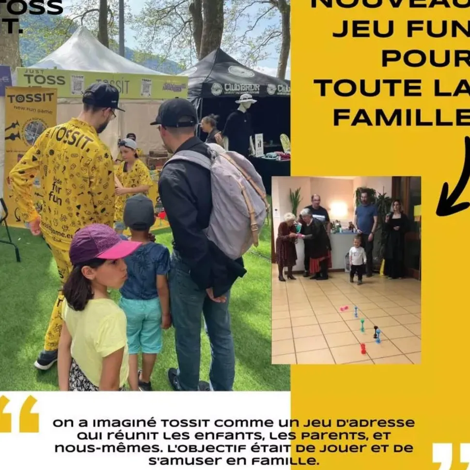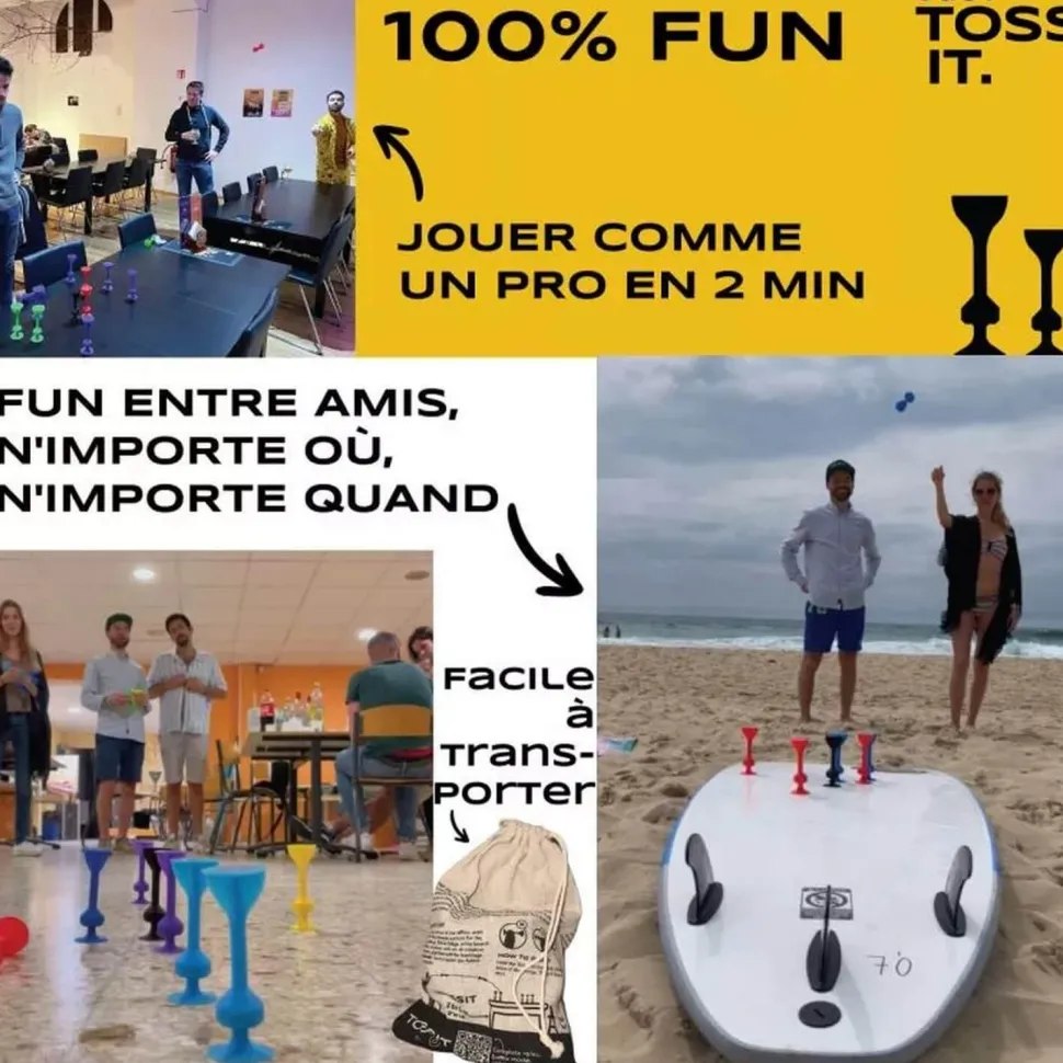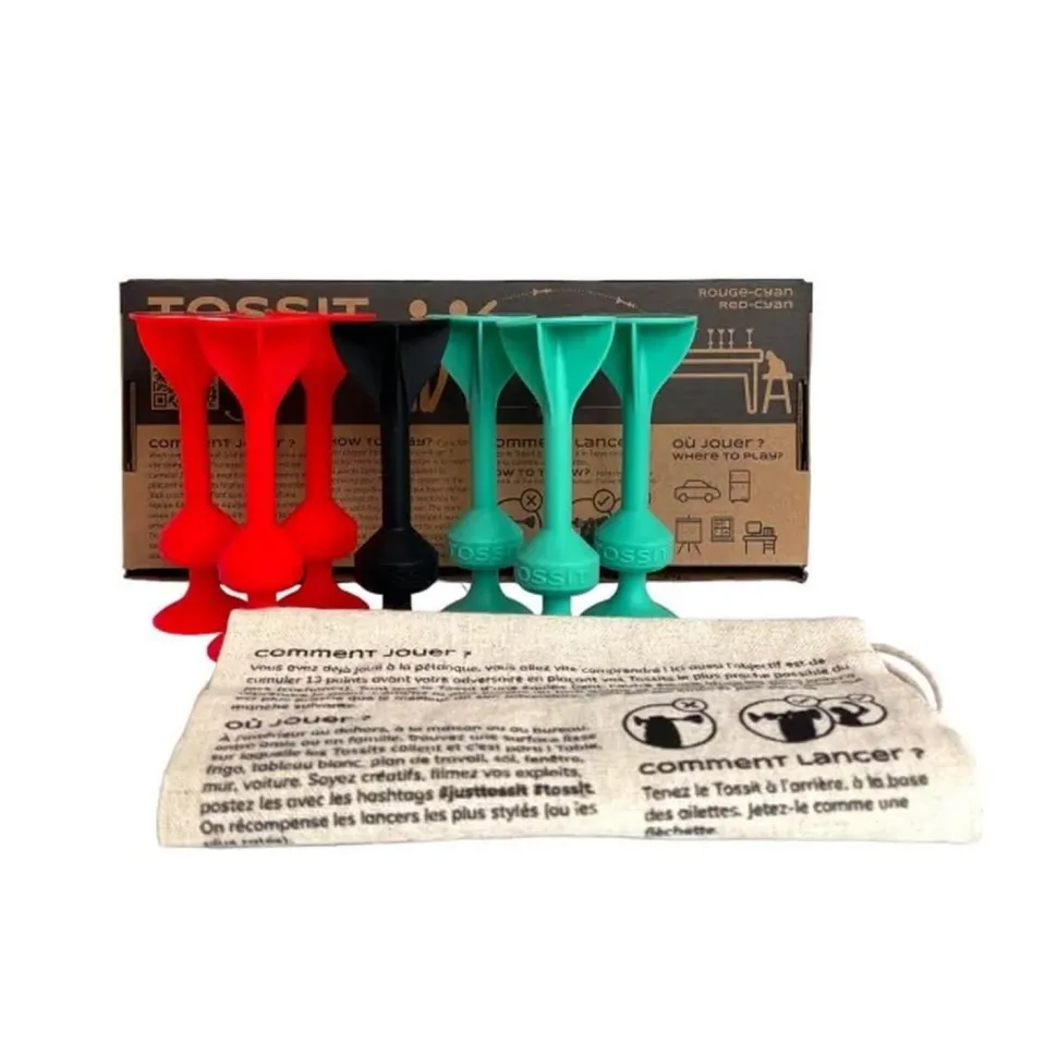 TOSSIT est un jeu de précision mélangeant les fléchettes et la pétanque. Grâce aux ventouses situées à chaque bout des projectiles, TOSSIT peut se jouer à l’extérieur comme à l’intérieur ! Ses ventouses s’accrochent sur pleins de types de surfaces : fenêtre, sol, voiture, plafond… Parfait pour jouer avec ses amis, sa famille ou entre collègues !