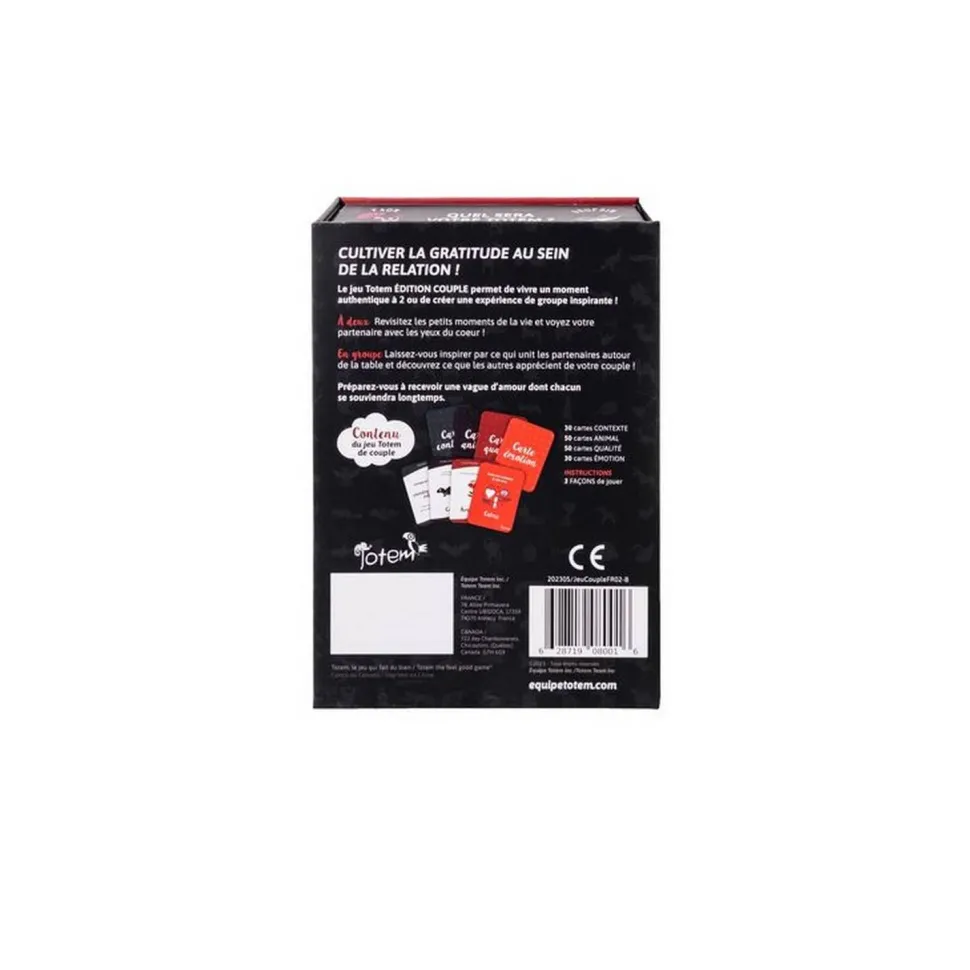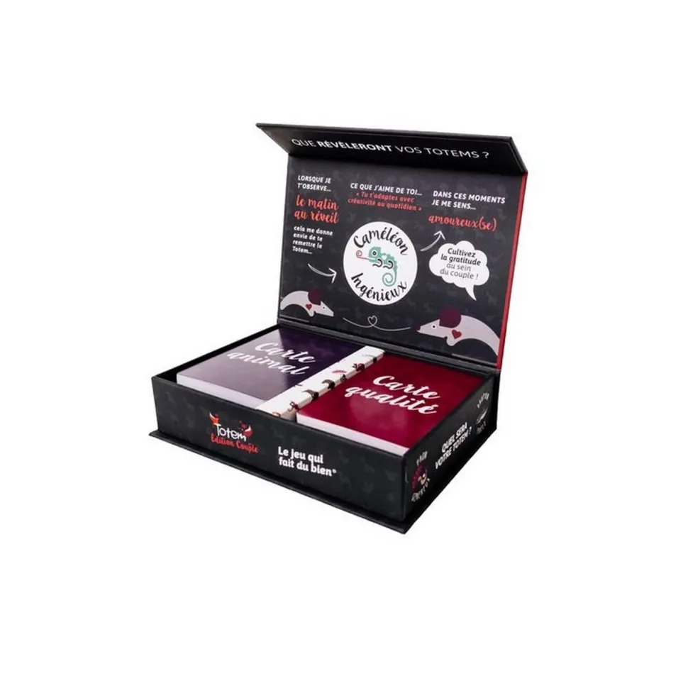 Totem Couple offre une expérience engageante, remplie de moments de complicité, de rires et de partage. Il est conçu pour inspirer des conversations sincères et pour encourager l’écoute active. Chacun aura l’occasion de s’exprimer, de partager ses idées et d’apprécier la diversité des points de vue.