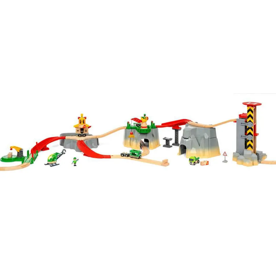 Le Circuit montagnes et chargement permet de jouer avec des grues et des actions de chargement sur 5 niveaux différents, de la zone d’atterrissage de l’hélicoptère aux grottes sombres des montagnes. Chacune des montagnes permet de créer toujours plus de circuits de trains, avec des hauteurs et des agencements différents. Utilisez l’hélicoptère, le train de transport de marchandises avec ses wagons ou le camion, pour vous aider à traverser et à travailler sur ce chantier dangereux.