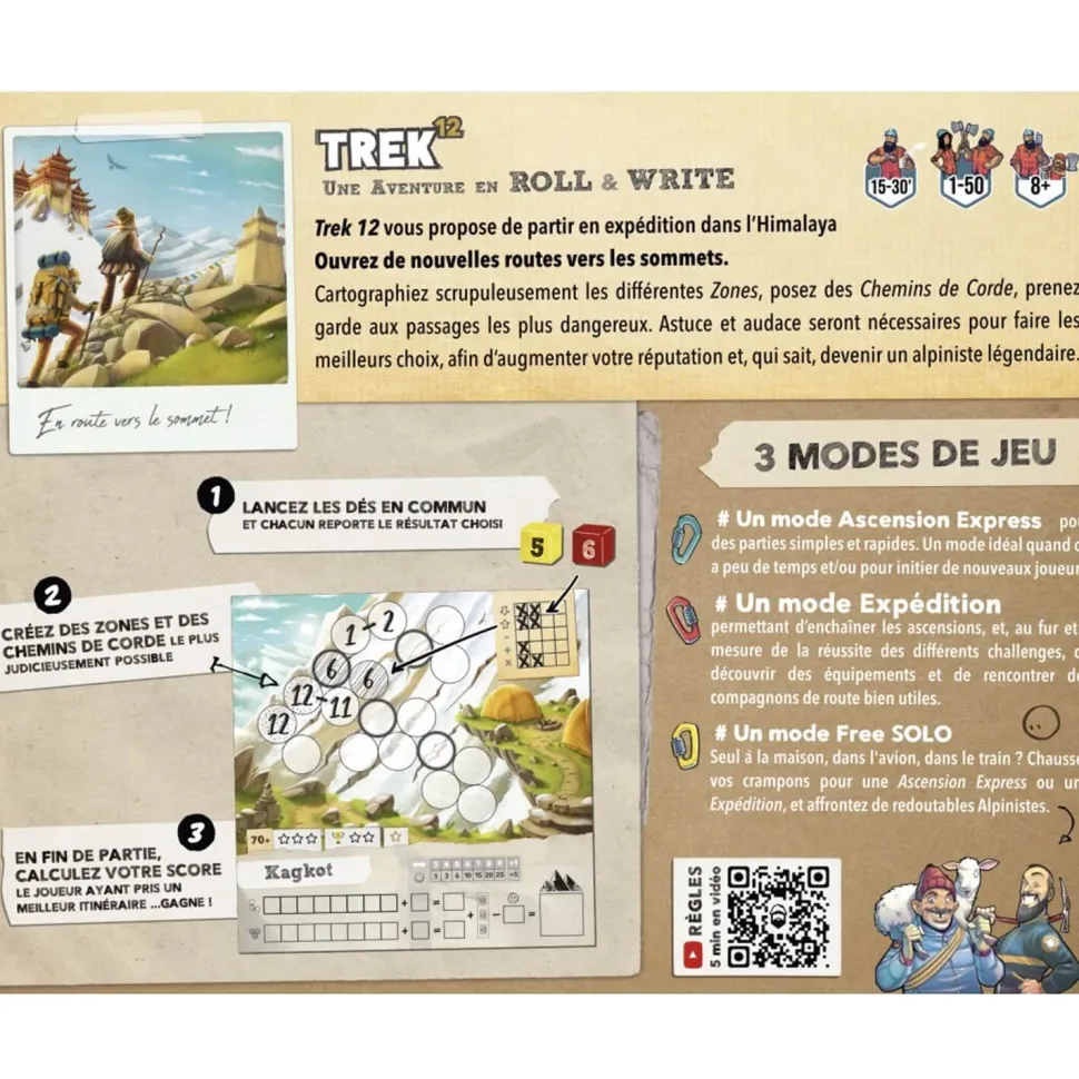 3 modes de jeu sont possibles : Un mode « Ascension Express » pour des parties simples et rapides. Un mode idéal quand on a peu (moins) de temps et/ou pour initier de nouveaux joueurs. Un mode « Expédition » permettant d’enchaîner les ascensions, et, au fur et à mesure de la réussite des différents challenges, de découvrir des équipements et de rencontrer des compagnons de route bien utiles. Enfin, un mode « Free SOLO ». Seul à la maison, dans l’avion, dans le train ?