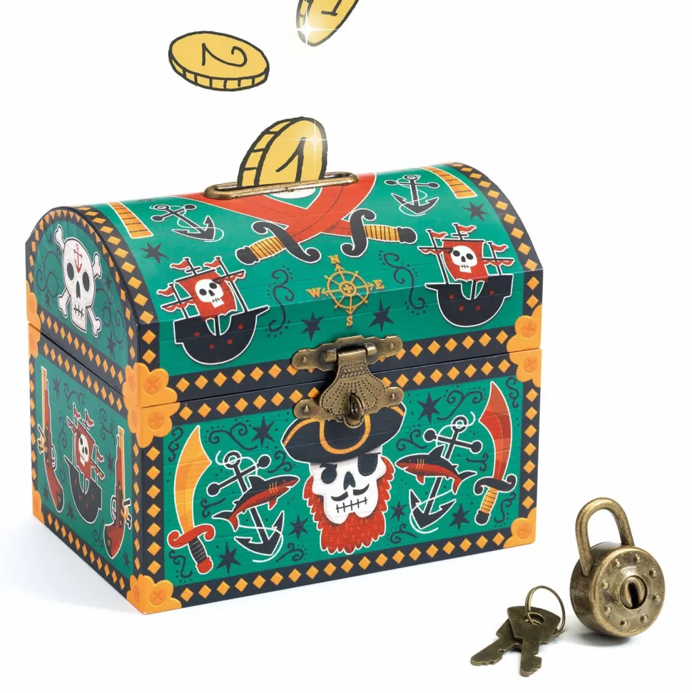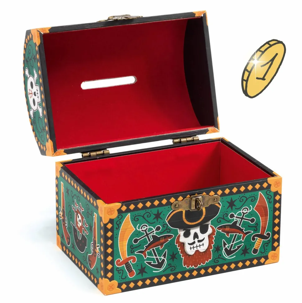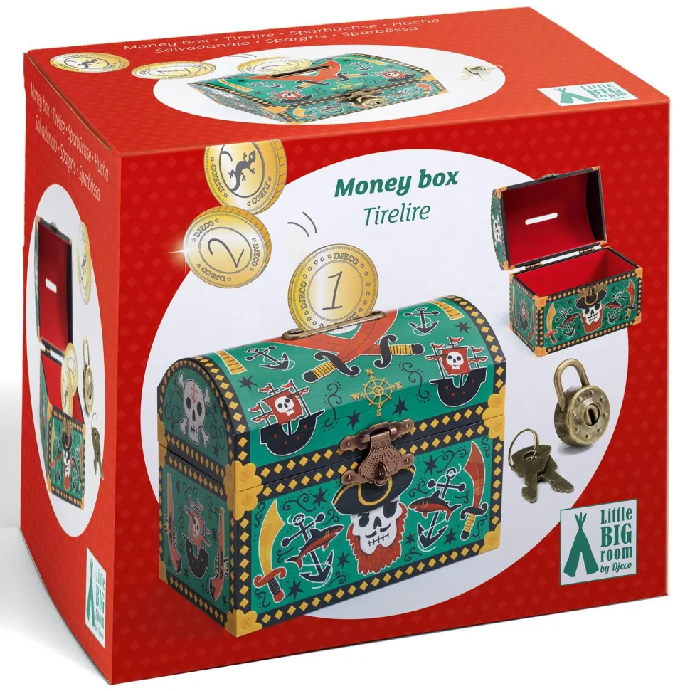 Découvrez la gamme Trésor avec la collection LITTLE BIG ROOM et la tirelire Pirate de la marque Djeco. Cette superbe tirelire en forme de coffre au trésor séduira tous les petits aventuriers. Illustrée dans un style pirate captivant, elle servira à la fois d’objet de décoration et de cachette pour les économies. Grâce à sa fente protégée par un rebord en métal, les pièces peuvent être glissées en toute sécurité, sans abîmer le bois. Le coffre est sécurisé par un cadenas métallique, et deux clés sont incluses pour ouvrir la tirelire à tout moment. L’intérieur est délicatement protégé par un fond en velours pour une finition soignée et précieuse. Une tirelire originale et durable, idéale pour apprendre à gérer son petit trésor !