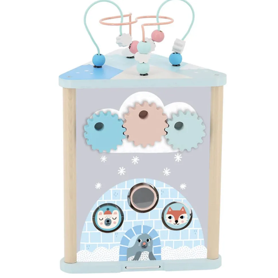Que de choses à découvrir : des engrenages à actionner, des petites têtes à pivoter, un hibou et un renard à faire voyager, un cylindre de neige à faire tourner et des perles et nuages à déplacer sur un fil ! Dans l’igloo de l’ours, une petite porte latérale avec des charnière élastiques permet à l’enfant de récupérer les pièces qu’il aura encastrées sur un des côtés.