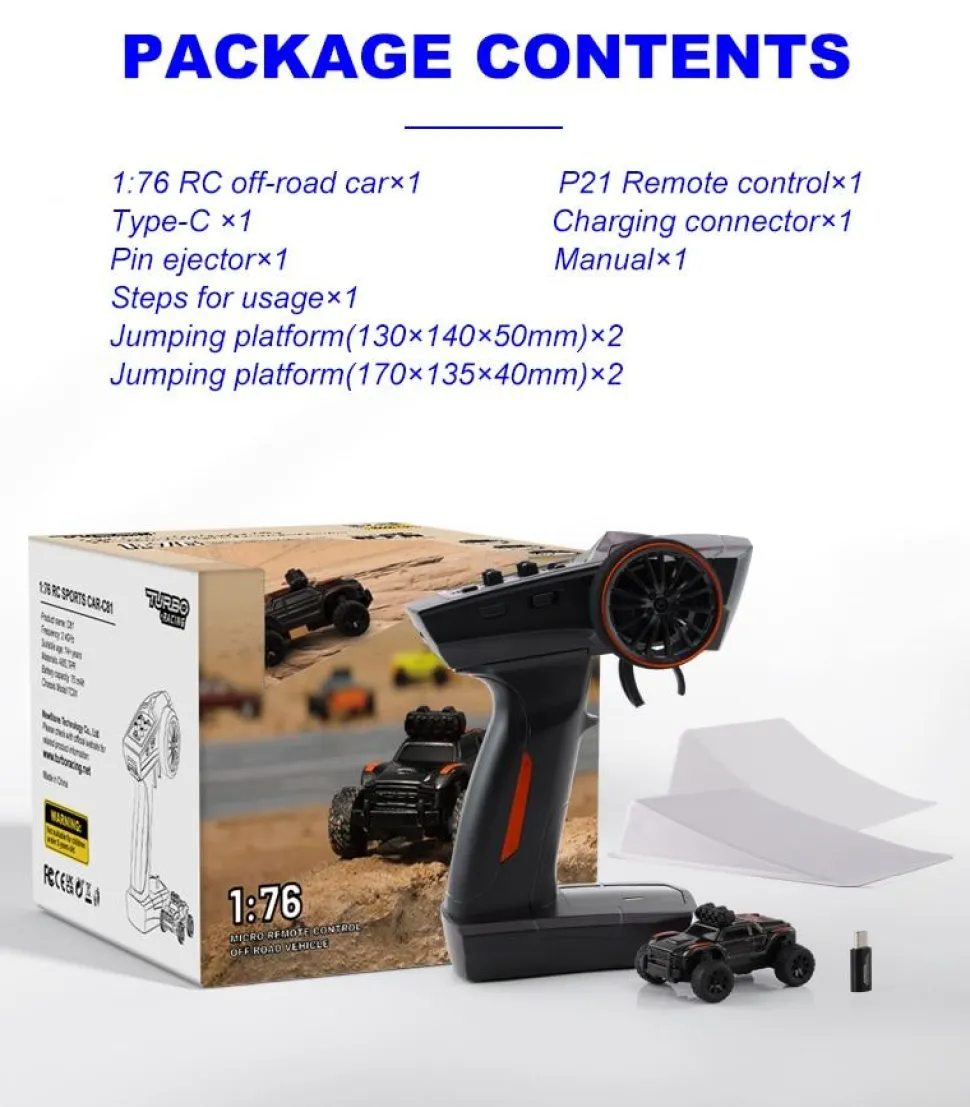 Contenu de la livraison du MICRO MONSTER TRUCK RTR 1/76ÈME Jaune de chez TURBO RACING :