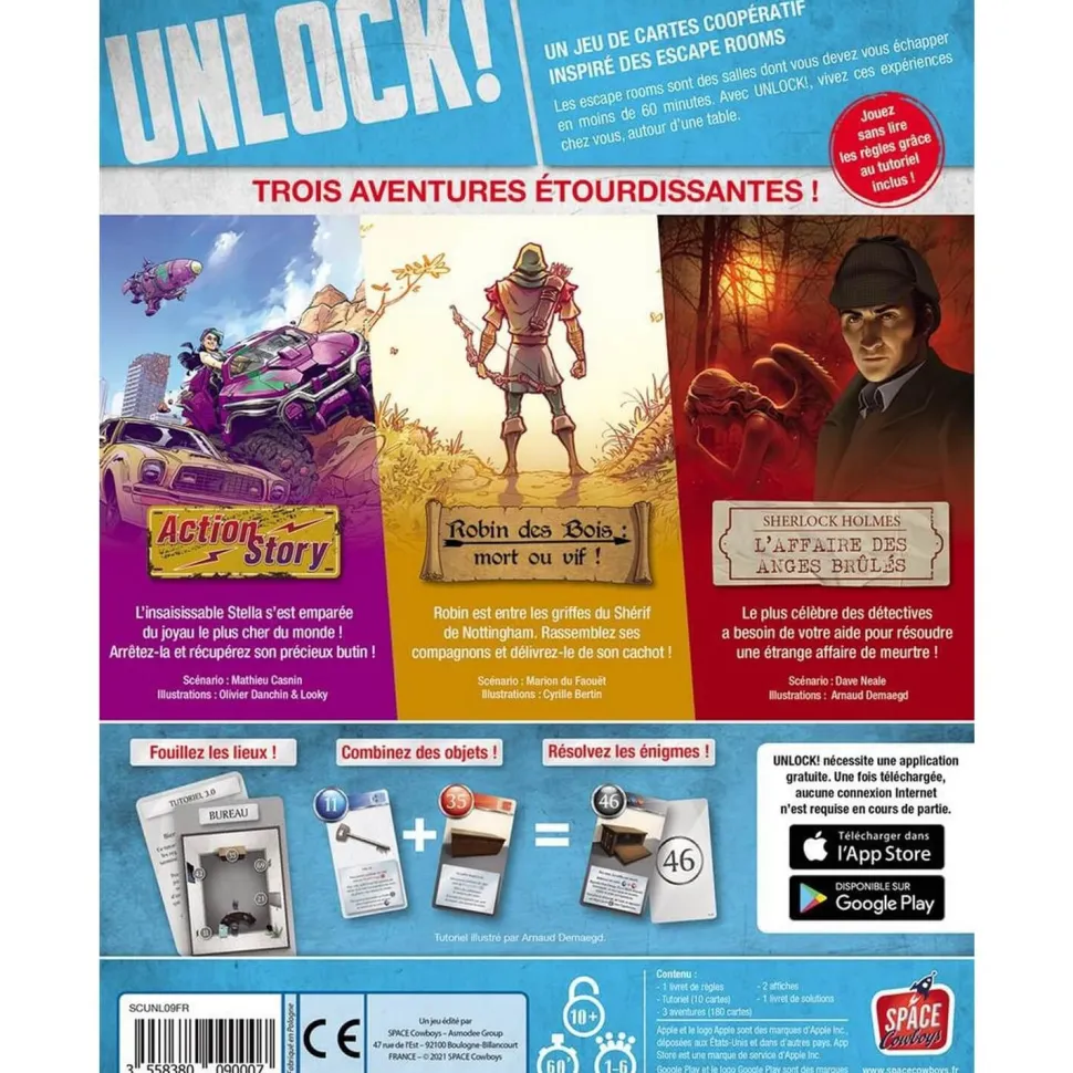 Venez à bout d’aventures qui vous proposent des enquêtes, des poursuites, de l’infiltration et même du tir à l’arc ! C’est, à coup sûr, une boîte Unlock! pleine d’action ! Unlock!, ce sont les sensations des escape rooms dans votre salon, grâce à un « simple » jeu de cartes et une application gratuite.