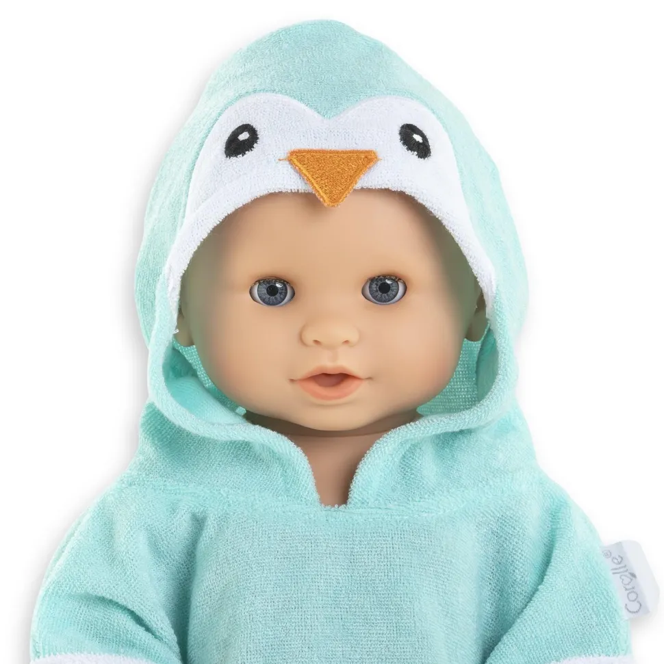 Cette amusante cape de bain à la capuche « tête de pingouin » séchera et réchauffera les grands poupons de 36cm à la sortie du bain.