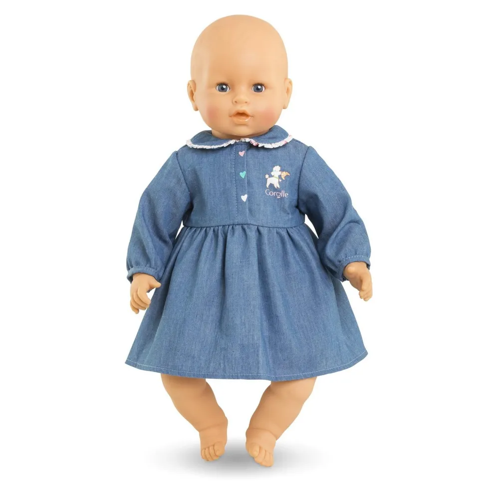 Cette robe bleue, imitation denim, est ornée d’un joli col claudine bordé de volants imprimés dans le tissu exclusif de la collection Week-End à Paris, ajoutant une touche de fantaisie et d’élégance. Sur la poitrine, une adorable sérigraphie de petit chien tenant un croissant dans sa gueule accompagné du logo Corolle apporte une note ludique à la tenue tandis que les petites boutons en forme de coeurs colorés sur le devant accentuent le côté tendre et amusant de la robe.