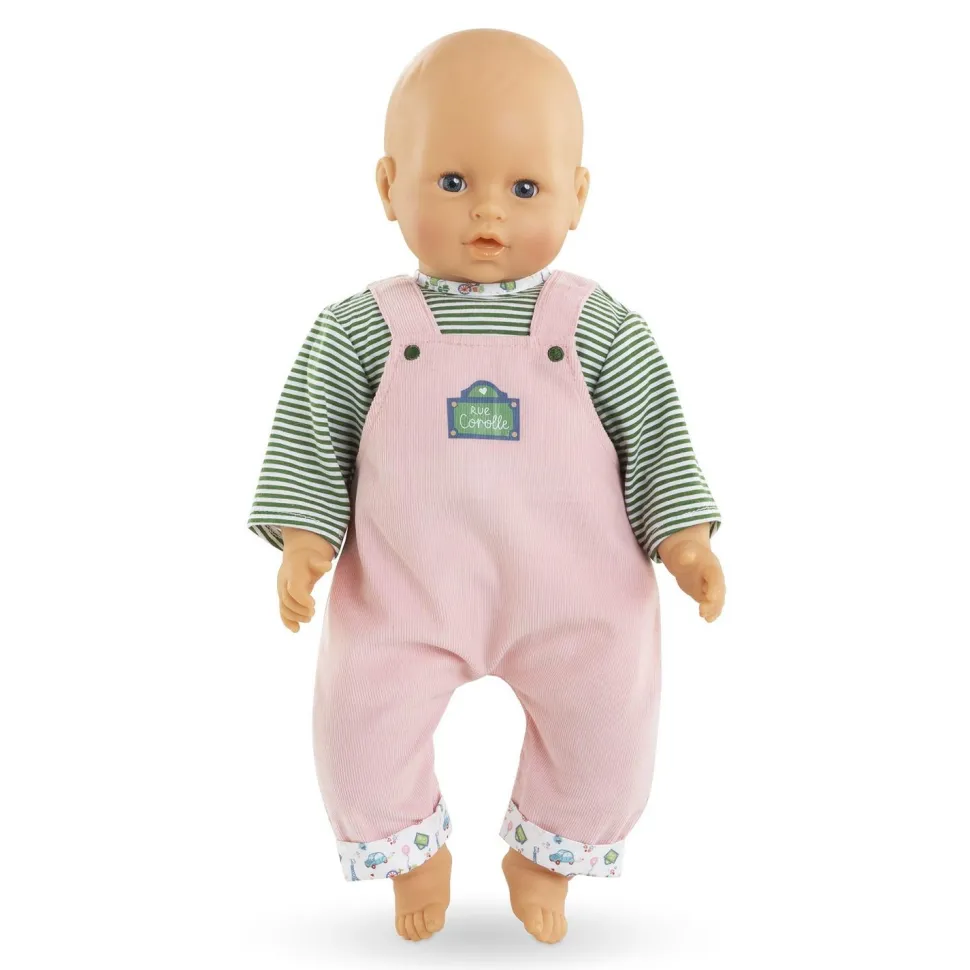Composé d’une salopette en velours côtelé rose et d’un t-shirt rayé vert et blanc tout-en-un, on retrouve le tissu exclusif de la collection Week-End à Paris sur le col du t-shirt et les ourlets de la salopette. Cette dernière, ornée d’une sérigraphie « rue Corolle » reprenant la signalétique des rues parisiennes inspire les balades en ville avec son poupon.