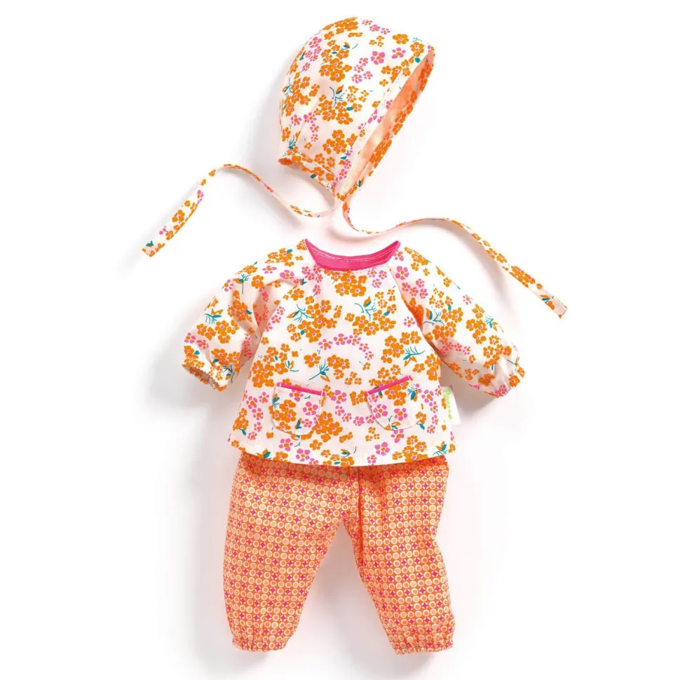Ensemble de vêtements pour poupon Poméa de la marque Djeco comprenant 3 pièces légères aux imprimés fleuris et colorés, parfait pour une balade estivale.